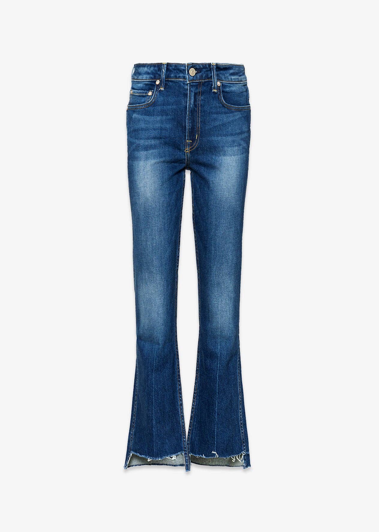 JEAN ÉVASÉ À COUPE COURTE AVEC OURLET EN BIAIS À TAILLE MI-HAUTE DENIM STRETCH CONFORT, TAILLE MI-HAUTE, DÉTAILS DÉLAVÉS, OURLET EN BIAIS, LONGUEUR COURTE, JEAN ÉVASÉ HAUTEUR DEVANT : 9" / ENTREJAMBE : 27" / OUVERTURE DE JAMBE : 16" LE MODÈLE MESURE 5'10" ET PORTE UNE TAILLE 26