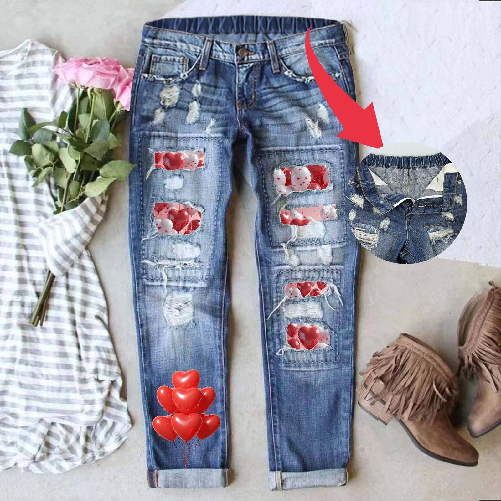 * 70 % coton, 30 % polyester. Jeans pour femmes extensibles déchirés et usés, jeans à la cheville. * Fermeture à bouton et fermeture éclair, appliqué imprimé tie-dye coloré, tissu lavé et usé, trous déchirés, bords bruts, jeans taille mi-haute avec vêtements actifs extensibles. * Vous pouvez compléter le look décontracté en associant ce jean droit déchiré à imprimé tie-dye coloré avec une variété de débardeurs, t-shirts, chemises, pulls, etc., ce qui apportera un style différent. * Les jeans boyfriend conviennent pour Noël, le bureau, le quotidien, les rendez-vous, les fêtes, la plage et d'autres scènes. Conçu avec une élasticité limitée — pour un meilleur ajustement, envisagez de commander une à deux tailles au-dessus. Les étiquettes de marque ne sont pas incluses par défaut. Si nécessaire, veuillez les ajouter via ce lien (0,50 $/pc) : https://www.faire.com/product/p_kzks8vegvk