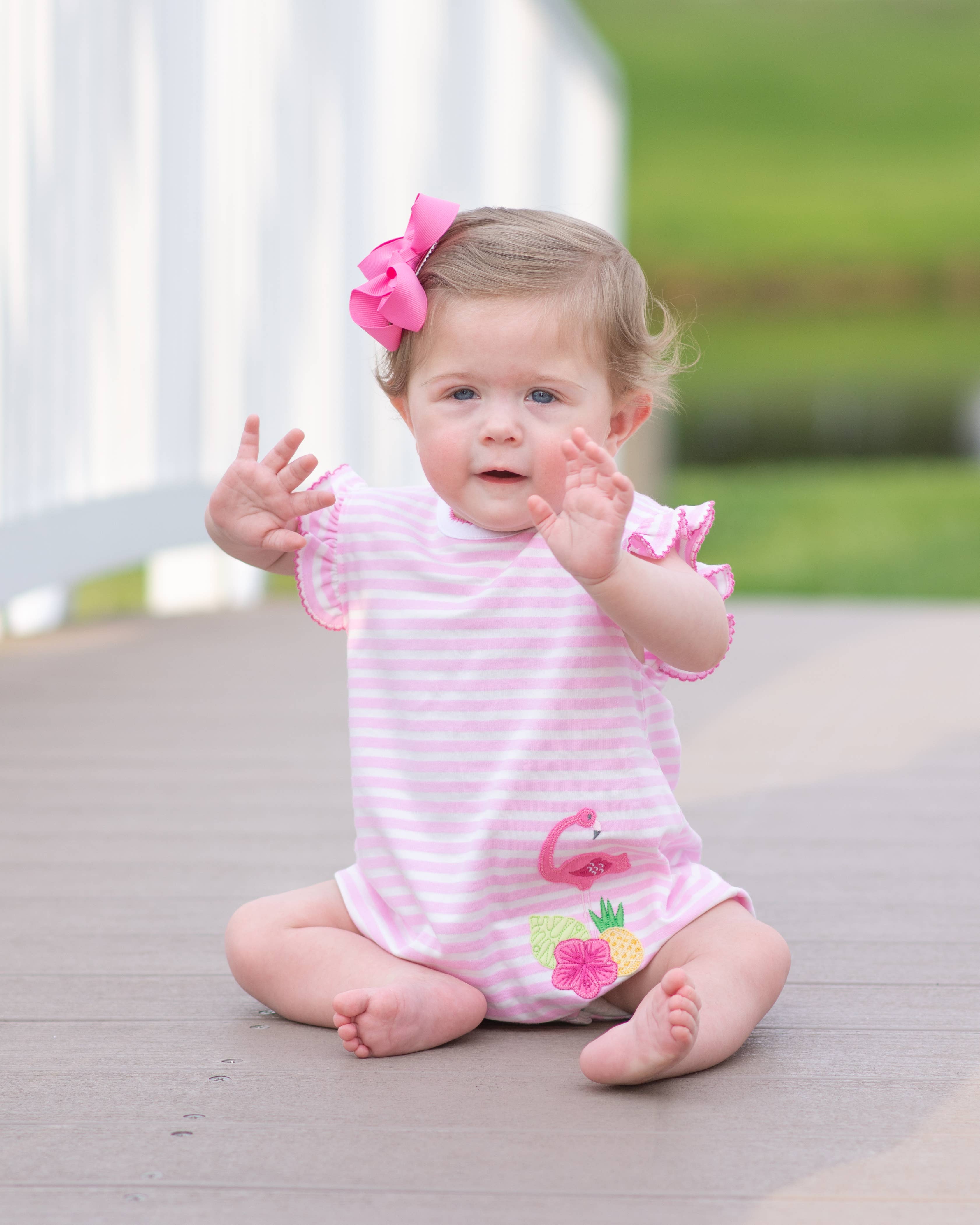 De jolis nœuds et des rangées de volants à l'arrière ajoutent une touche spéciale à cette adorable barboteuse pour bébés filles. Dotée d'ouvertures élastiques aux jambes pour un ajustement confortable et de boutons-pression pour des changements de couche rapides, cette tenue tout-en-un est sûre de créer des sourires et des compliments où que sa journée la mène ! Les clients adorent cet imprimé flamant rose doux et estival ! Des flamants roses vifs et des feuilles de palmiers bleues tropicales vous mettront en mode vacances. Se marie bien avec Vintage Aqua, Pink. Instructions d'entretien : Lavage en machine à froid ; uniquement de l'eau de Javel non chlorée si nécessaire ; séchage en machine à basse température Composition du tissu : 85 % coton / 15 % modal Code de référence : G1901