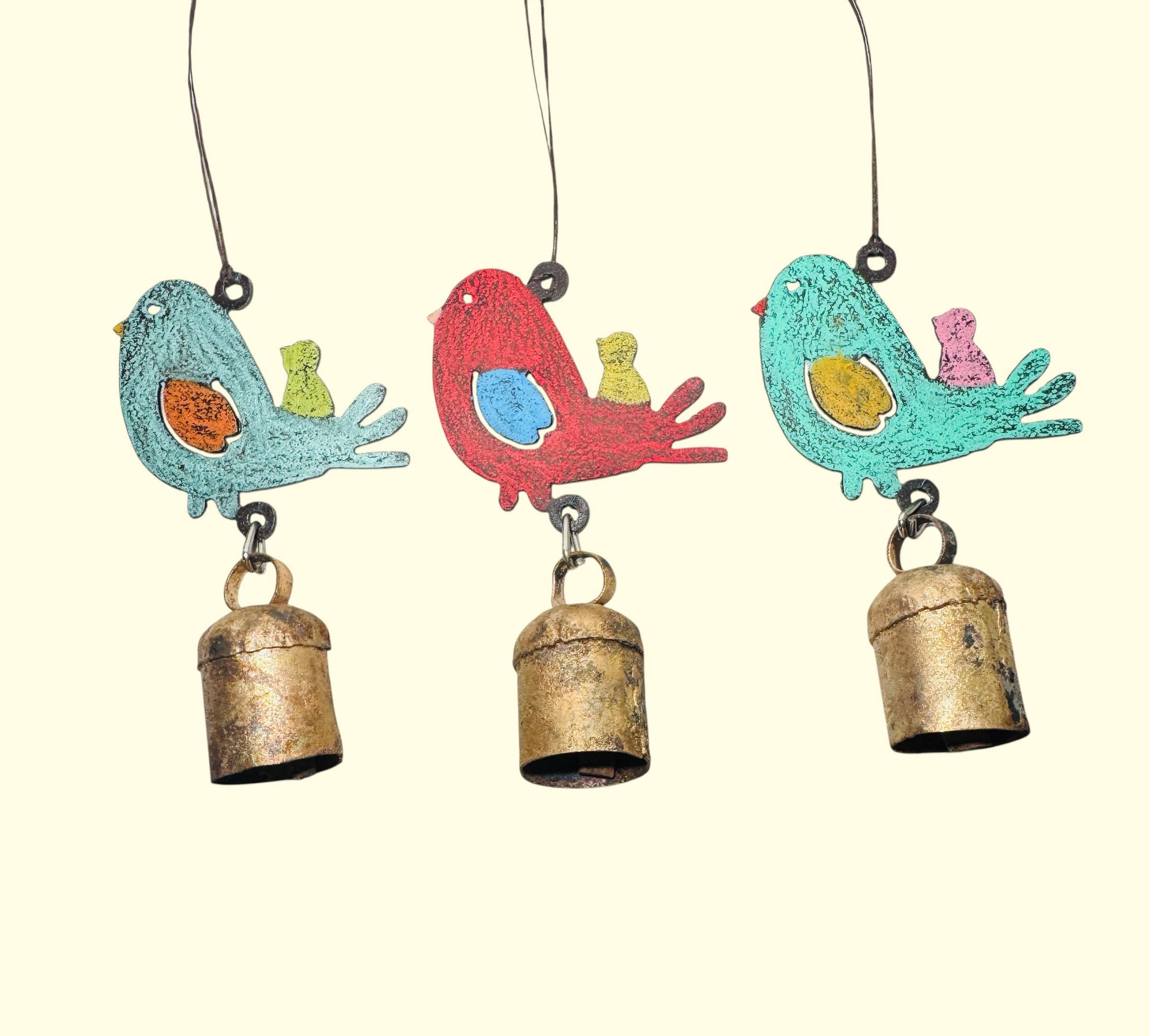 Ces petits oiseaux fantaisistes sont un véritable succès ! Fabriqué à partir de vitraux opalescents ayant subi plusieurs cuissons dans un four à verre. Ils se déclinent dans des tons de bleus, d'aquas, de jaunes et de verts accentués de couleurs vives. Ils mesurent environ 7 pouces x 6 pouces et, avec des carillons, ils mesurent environ 12 pouces de long.