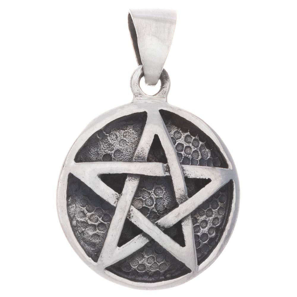 Diamètre de 18 mm avec une bélière fixe/coulée. Ce pendentif est à peu près de la taille d'une pièce de cinq centimes ! Le pentacle est une étoile à cinq branches à l'intérieur d'un cercle. Les cinq branches représentent les cinq éléments : le feu, l'air, l'eau, la terre et l'esprit.