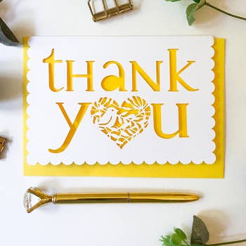 Merci beaucoup ! Envoyez votre gratitude avec cette carte de vœux 5x7 ! Cette carte est livrée avec une enveloppe en papier kraft et son intérieur est vierge pour être personnalisée avec votre propre note.
