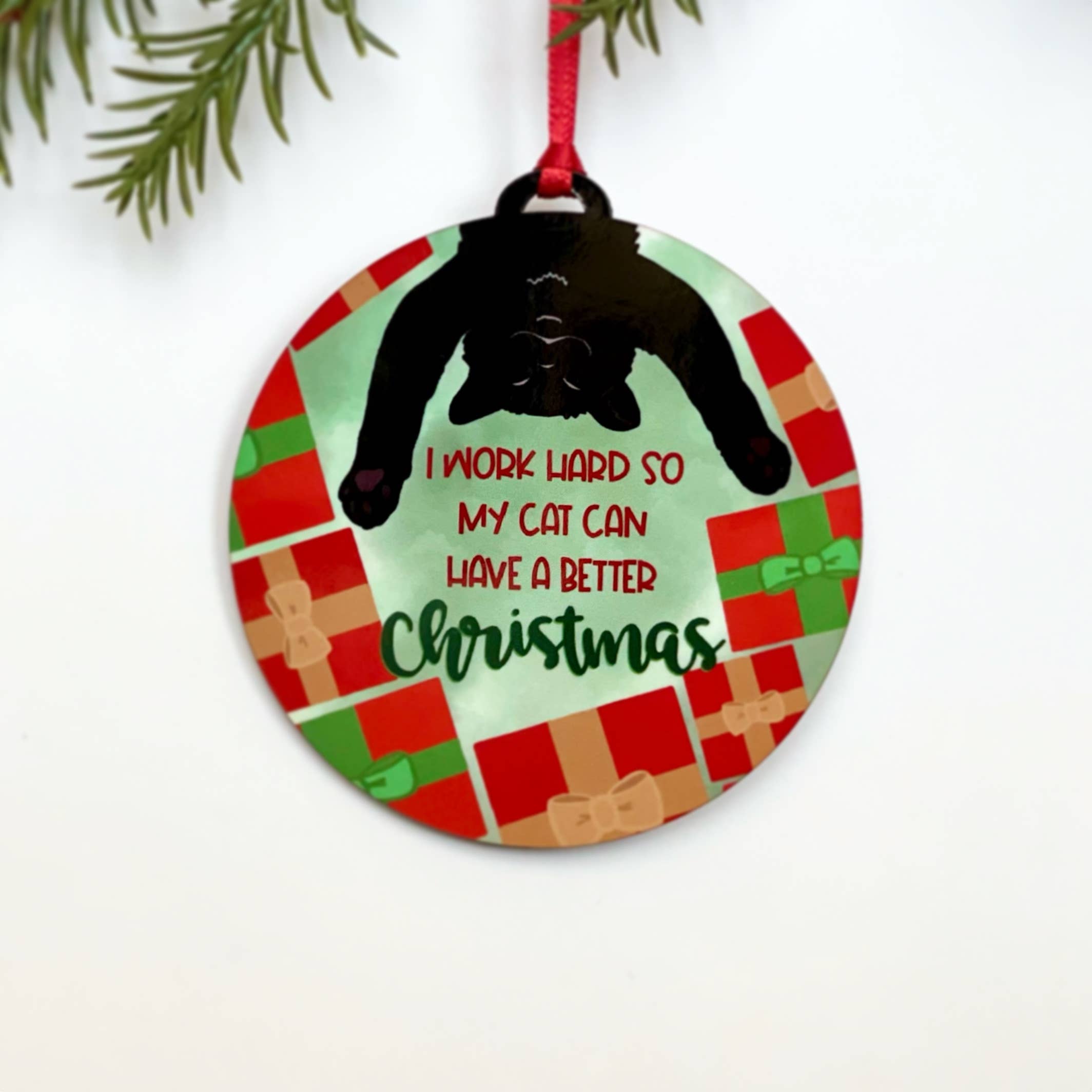 Décoration de Noël ludique avec chat. Chats disponibles en noir, blanc, or et gris. Le noir est le plus demandé ! Ornements en plastique incassable. Chaque boule mesure environ 7,6 cm de hauteur et contient un autocollant "flottant" de chat qui semble jouer avec les confettis et petits objets festifs à l'intérieur. Les "jouets" à l'intérieur peuvent varier selon la disponibilité des fournitures. Chaque boule est expédiée emballée dans du papier de soie dans une boîte-cadeau de la marque. À NOTER : Les décorations seront disponibles à la commande jusqu'à la fin octobre seulement.