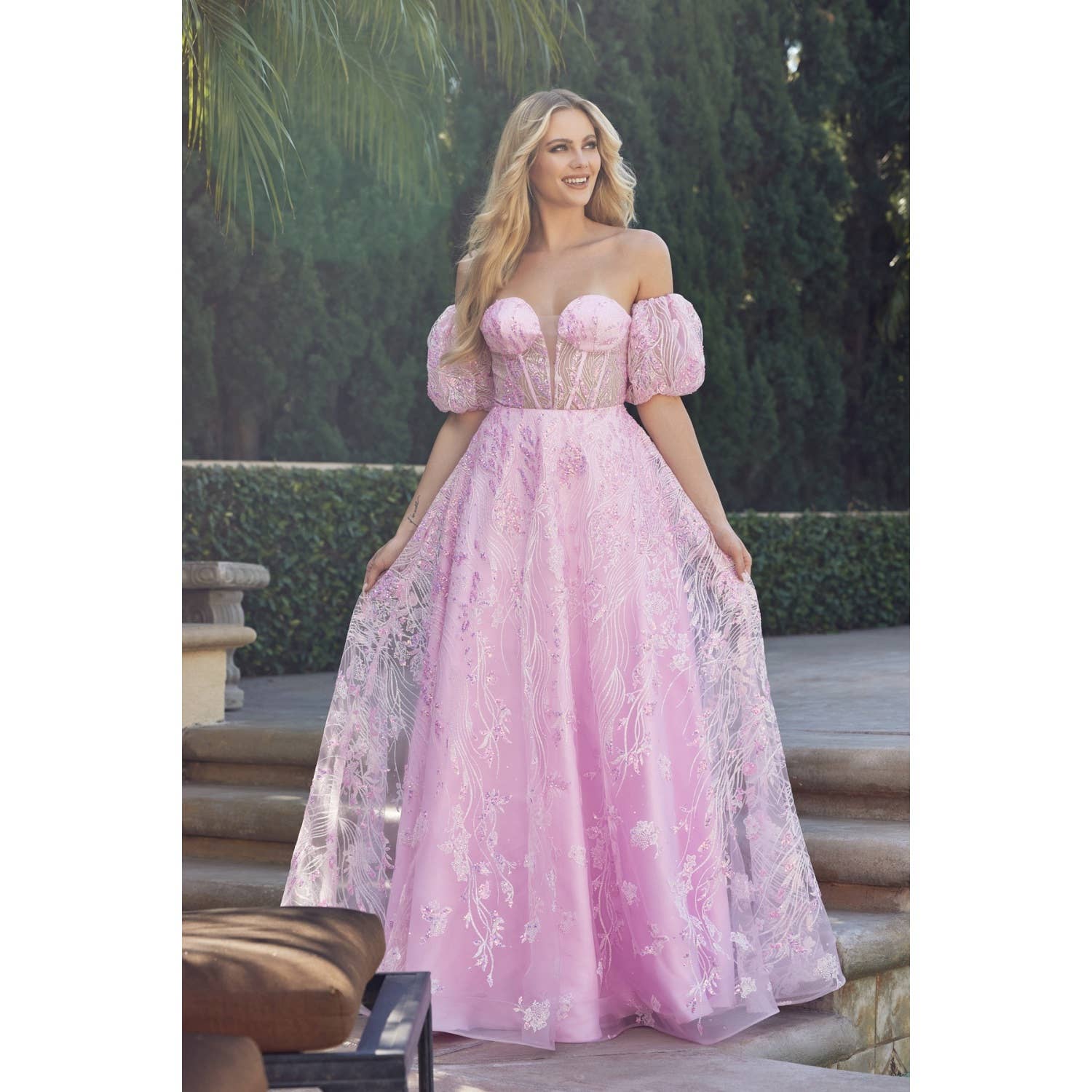 Robe de bal à manches transparentes avec appliques florales et corsage perlé pour Quinceañera