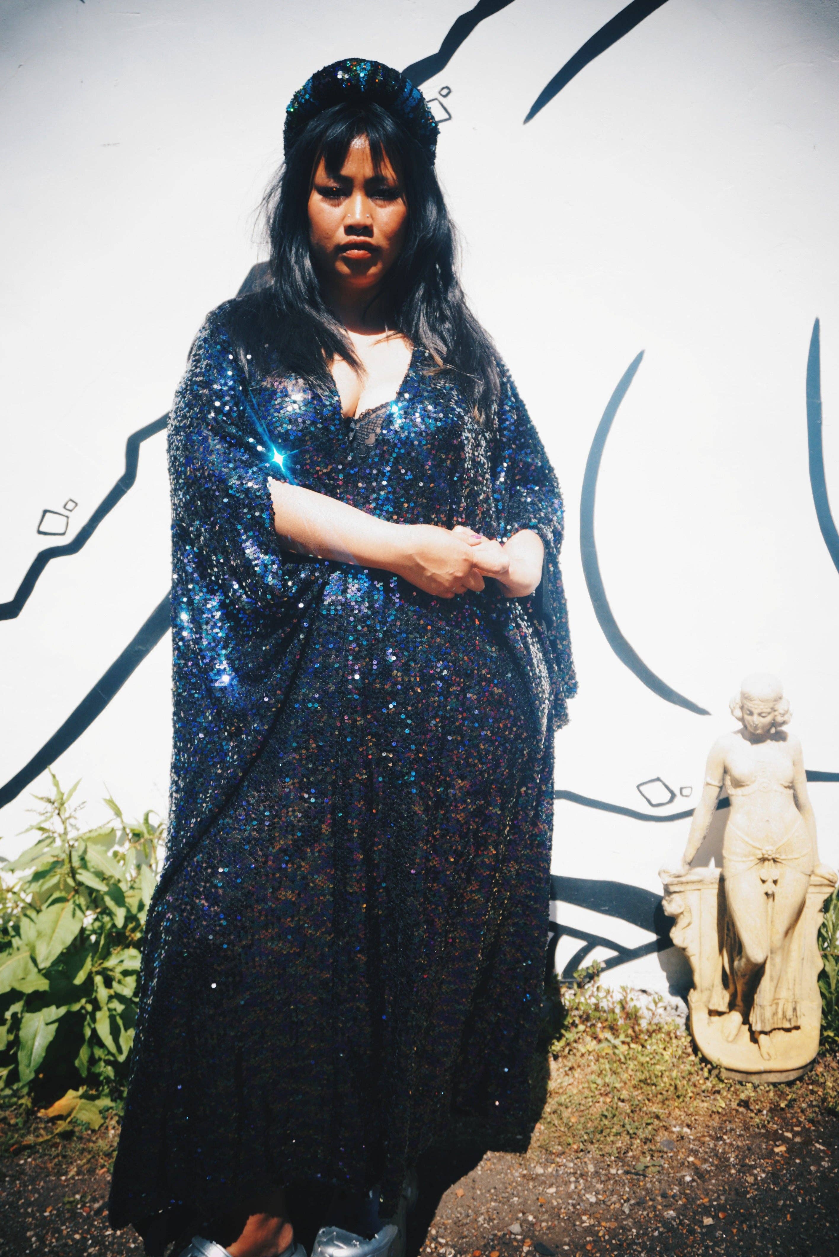 Robe caftan maxi ou kimono en sequins holographiques bleu turquoise. Ces sequins sont lourds sur une base en maille avec un peu d'élasticité. Le style illustré est un décolleté plongeant en V - nous pouvons également le réaliser dans notre style à encolure bateau (voir ici) si vous souhaitez ce style, veuillez l'ajouter à vos notes de commande lors du paiement. Conçus pour captiver, ces caftans sont fabriqués à partir de tissus exclusifs de fin de série, garantissant que chaque pièce est aussi unique que votre clientèle. La disponibilité est strictement limitée, ajoutant une touche d'exclusivité à votre inventaire. Caractéristiques principales : - Design polyvalent : Des rubans de velours cachés à l'intérieur permettent deux looks époustouflants : portez-le ample et fluide pour une silhouette décontractée, ou resserrez la taille pour une coupe flatteuse et encadrante. - Attrait universel : Taille unique UK 6–32, s'adressant à de nombreux clients. Détails du produit : - Modèle présenté : taille UK 10, hauteur 5'4". - Décolleté plongeant : env. 31 cm (épaule au point V). - Non doublé - Lavage à la main ou nettoyage à sec - Longueur - 138 cm
