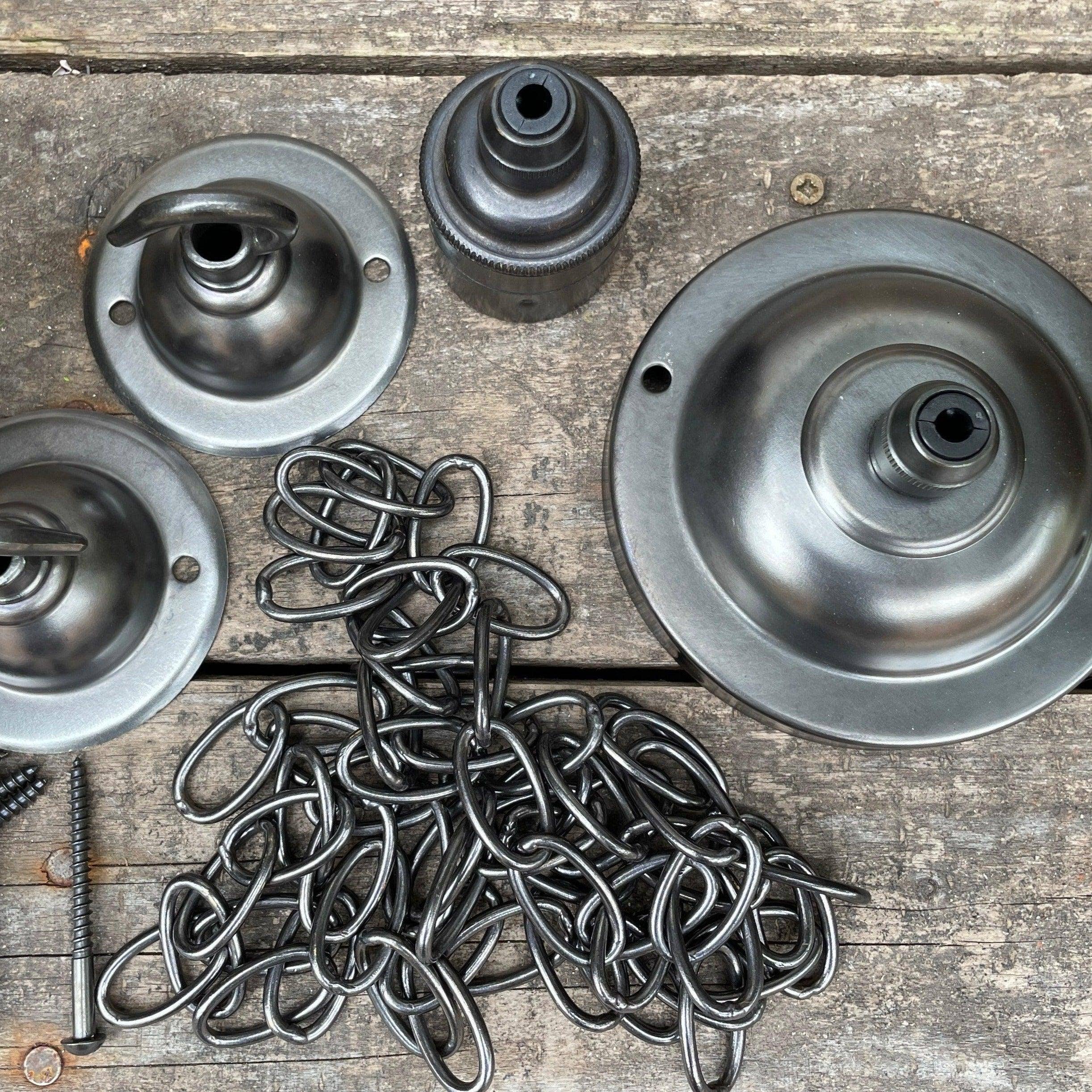 Voulez-vous essayer de fabriquer votre propre lustre chez vous ? Nous avons tout le matériel dont vous avez besoin pour transformer un morceau de votre propre bois en un magnifique lustre en poutre de bois. Ce kit est disponible en bronze ou en laiton vieilli anglais. Ce kit est conçu pour percer des trous dans votre bois et laisser les câbles passer à travers le luminaire. Si vous souhaitez enrouler vos câbles autour d'une poutre, veuillez consulter notre kit DIY d'enroulement. Contenu du kit : 5 douilles de lampe. 2 crochets de plafond + 4 vis. SWL 25KG chacun 1 cache-plafond avec serre-câble et étiquette de terre + 2 vis. 2 longueurs de chaîne (1 m au total - cela permet une descente de 25 cm du plafond au sommet du bois).