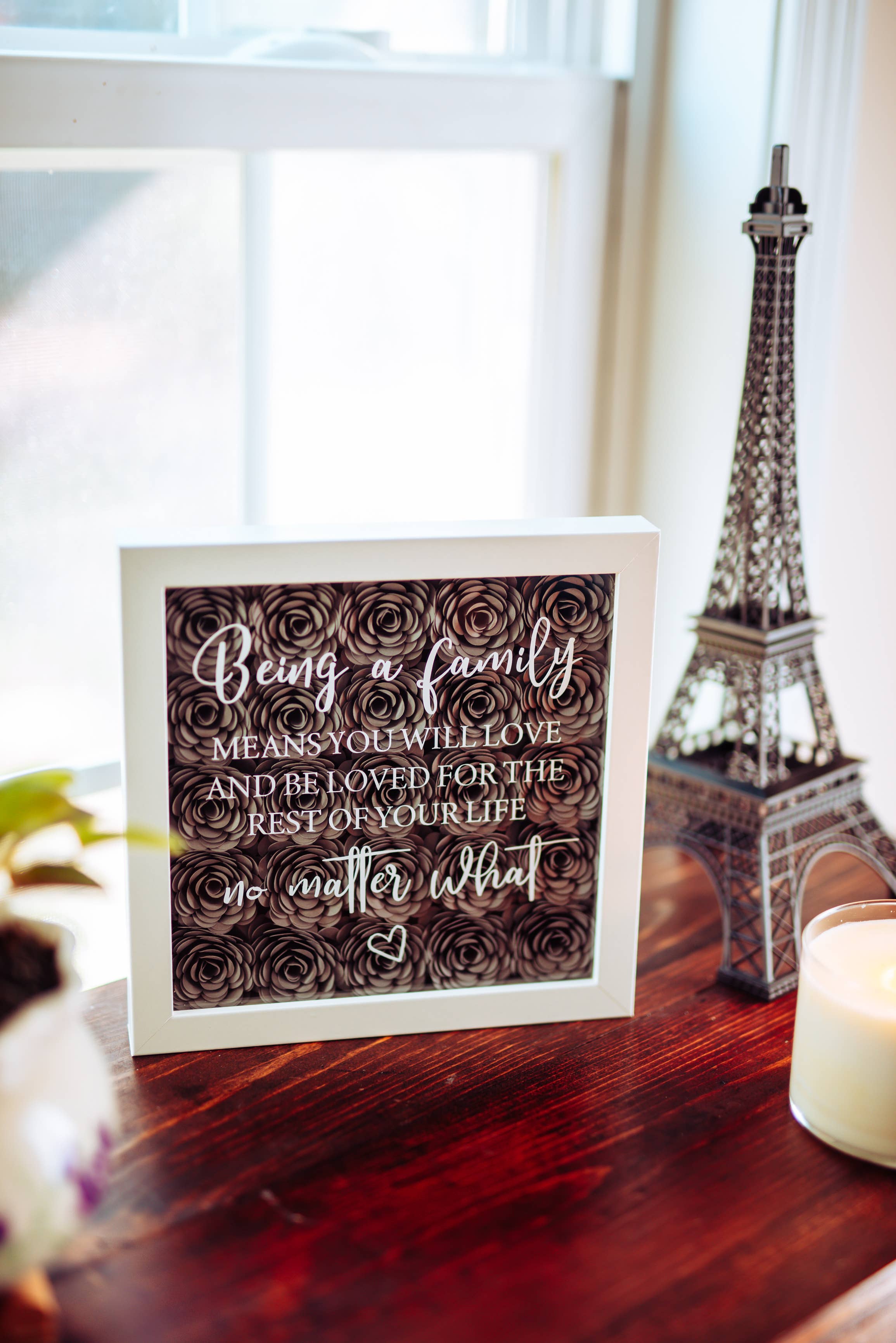 Nos boîtes d'ombres regorgent de magnifiques fleurs rouges en papier roulées à la main. De plus, le doux message sur le verre complète ce bouchon de spectacle. Cette boîte à ombres est un best-seller depuis quelques années maintenant ! Dimensions : -8 pouces de large x 8 pouces de hauteur x 1 pouce de profondeur Matériaux : -Fleurs en papier de haute qualité -Cadre en bois blanc -Avant en verre -Lettrage permanent en vinyle Caractéristiques : -Les boîtes Shadow peuvent se tenir debout et être affichées sur une étagère -Quincaillerie de suspension fixée et prête à être accrochée au mur Veuillez consulter le tableau des couleurs sur les photos de l'annonce pour des choix de couleurs spécifiques.