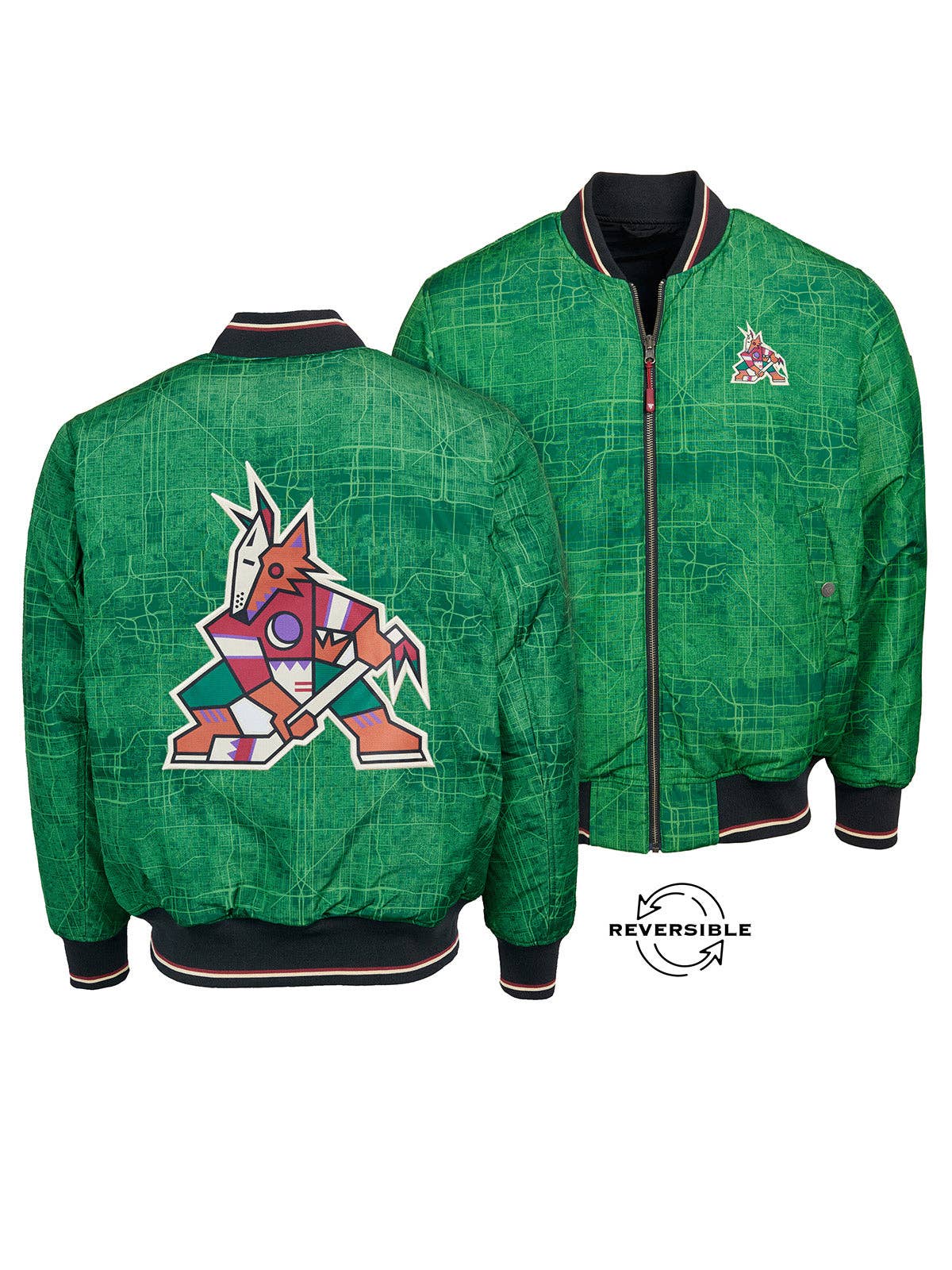 * Caractéristiques spéciales : blouson bomber réversible avec une finition époustouflante * Tissu imprimé : subtil et emblématique - Plan de la ville de Seattle sur la coque extérieure de la veste. Le côté réversible est de couleur bleu uni. * Logos : Grand logo du Seattle Kraken centré au dos de la veste, du côté du plan, et le logo de l'équipe sur le devant gauche de la poitrine. Le côté uni arbore le blason de l'équipe sur la manche droite. * Détail réversible : deux couleurs dans le col, les poignets et l'ourlet côtelés. Rayé aux couleurs de l'équipe sur la face imprimée numérique et bleu sur l'autre face. * Finition : propriétés hydrofuges et à séchage rapide pour vous garder au sec et à l'aise toute la journée * Type de fermeture éclair : cordon de fermeture à glissière réversible sur le devant aux couleurs de l'équipe * Type de poche : dans les deux sens, il est doté de poches à la taille avec boutons-pression