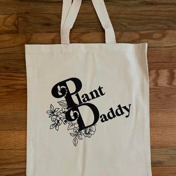 Sac fourre-tout Plant Daddy . Le texte est imprimé directement sur la toile. Pas de vinyle. Toile 100 % coton recyclé Poignées palmées en polypropylène de couleur contrastante de 22 po disponibles en noir, rouge ou bleu. Soufflet de 3 po au bas. Mesure 15 po l x 14 1/2 po H x 3 po P