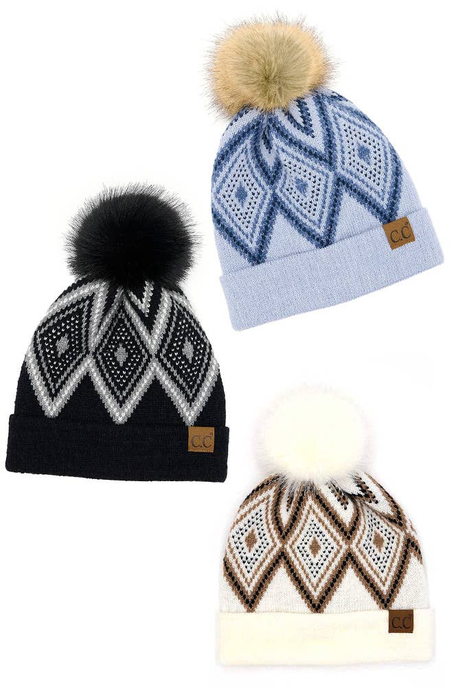 Bonnet à pompon motif crème, moutarde et marine S'accorde avec les mitaines M-417 Accent pompon en fausse fourrure naturelle Doublé en polaire 100 % acrylique Qté min. 2