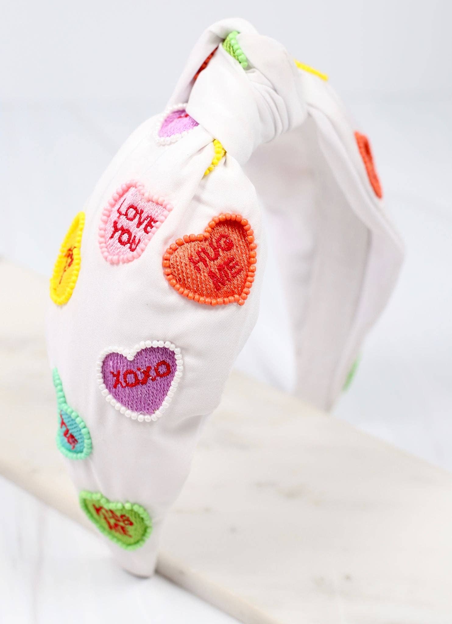 Cousu à la main avec amour, notre bandeau traditionnel à nœud en forme de cœur personnalisé ne vous apportera que paix, amour et bonheur. Déclinée en 4 couleurs vives, cette pièce tendance sera un incontournable pour donner une touche d'originalité à n'importe quelle tenue. * Le bandeau mesure 15,5 pouces d'un bout à l'autre * 2,5 pouces de large, le nœud mesure 1,5 pouces * Pierres en forme de cœur cousues à la main * Extrémités rembourrées pour coussin d'oreille * Intérieur satiné pour aider à éliminer les mèches rebelles * Disponible dans de nombreux coloris Pour chaque bandeau vendu, un bandeau est offert à un enfant malade.