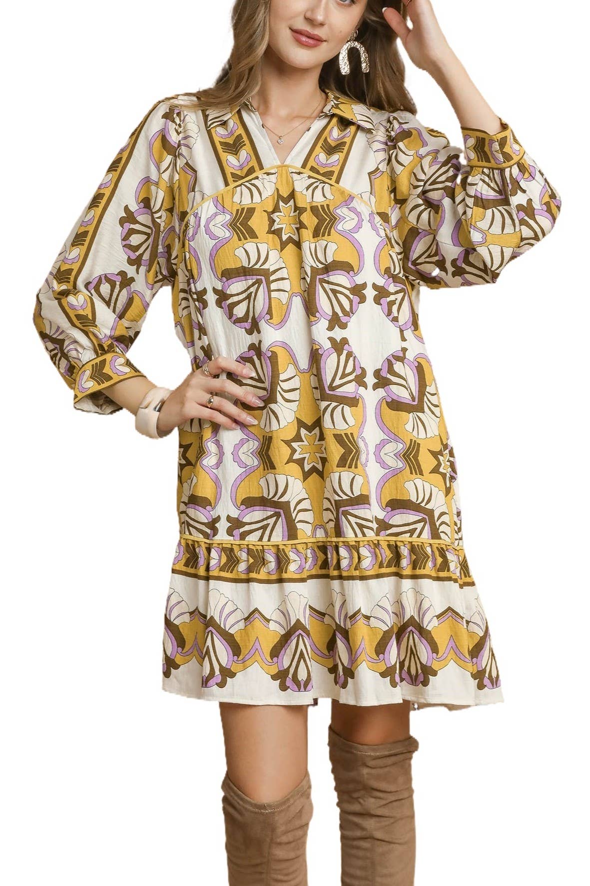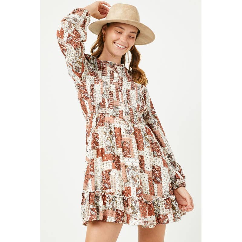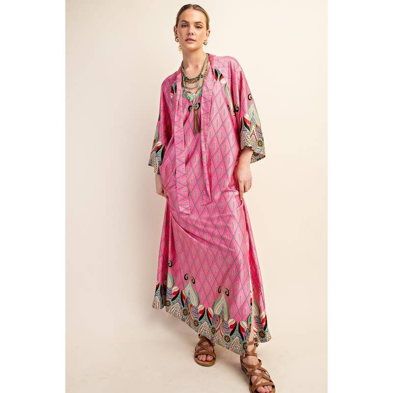 - Robe droite à imprimé bohème - Robe droite à manches longues avec imprimé bohème, poches latérales, col à revers, détail de garniture en coton tressé. - Le mannequin mesure 1,78 m et porte une taille S. - 77% RAYON 23% POLYESTER