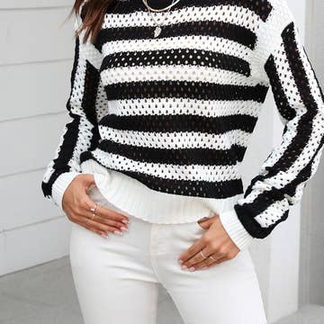 PULL À RAYURES À COL MONTANT À MANCHES LONGUES TISSU : PULL EN VISCOSE À RAYURES 49% VISCOSE 28% POLYESTER 23% NYLON - nouvelles arrivées, nouveau 2025, basique actif, actif usa, haut à rayures, pull à rayures, col montant, pull en viscose, automne, hiver, essentiel, incontournable