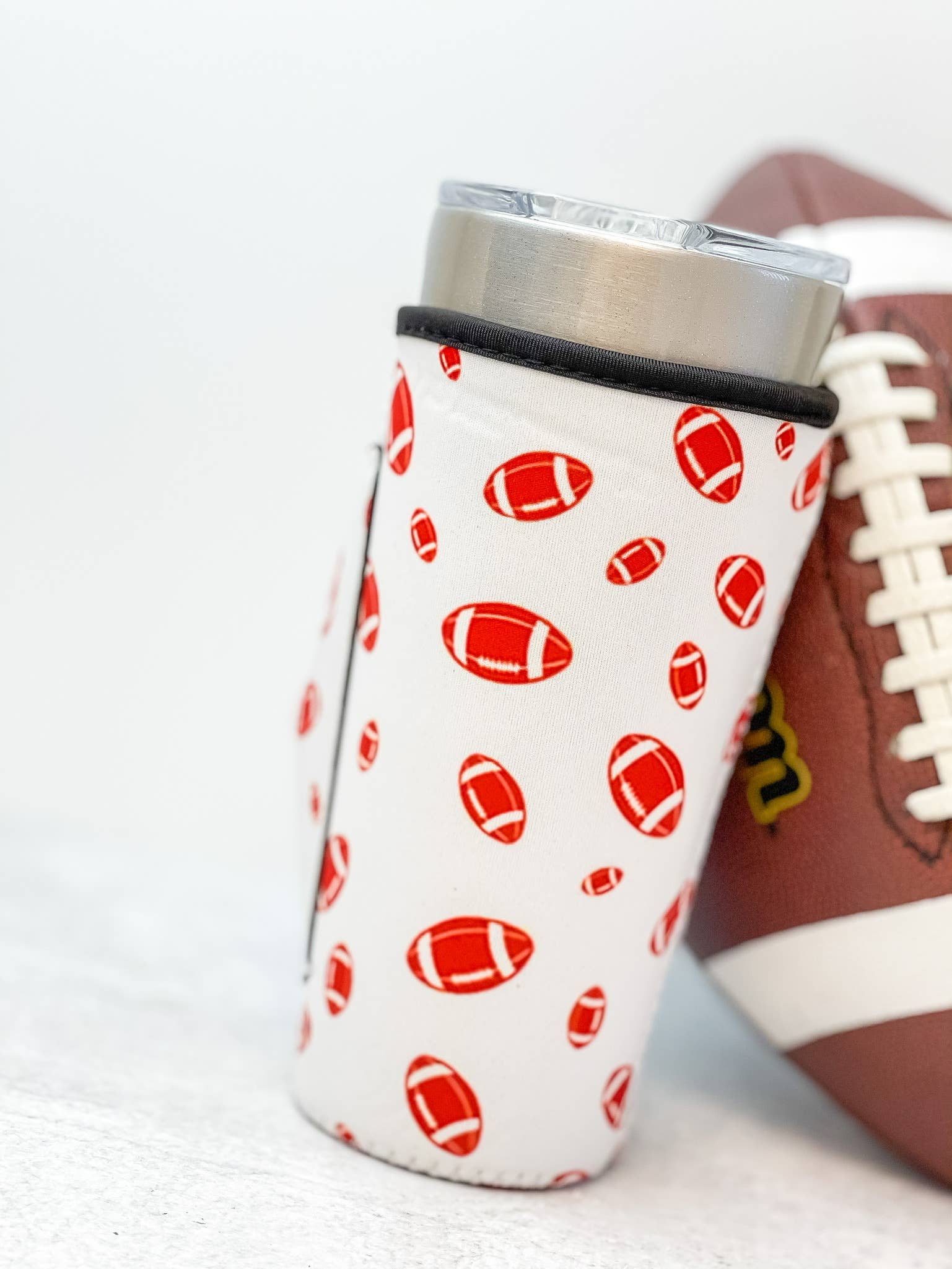 Notre glacière pour canettes de football est fabriquée en similicuir et doublée de néoprène pour garder votre boisson préférée au frais.