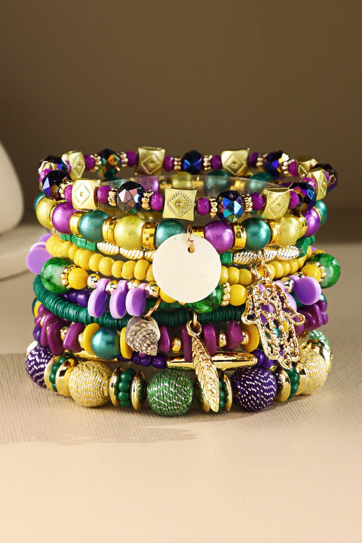 Pile de bracelets d'été rose vif, jaune, bleu sarcelle et argent
