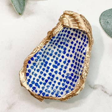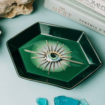Un cadeau spirituel pour la protection et la chance. On pense que quelqu'un qui obtient un grand succès ou une grande reconnaissance attire également l'envie de son entourage. Ce bibelot en coquille de palourde du mauvais œil est fabriqué à partir de coquilles de palourdes recyclées pour s'adapter à vos bagues ou à vos petits bijoux. Cette coquille de palourde à découpage est dorée avec des bords dorés. L'arrière de la coque est naturel. Les coques recyclées sont des créations uniques en leur genre. Il n'y a pas deux coquilles identiques ! Chaque coque a sa forme et sa taille uniques. La taille, la forme et le placement du design varient pour chaque coque individuelle. Taille approximative de la coquille de palourde : 4 po de largeur (taille moyenne)