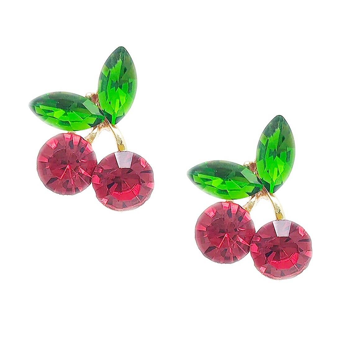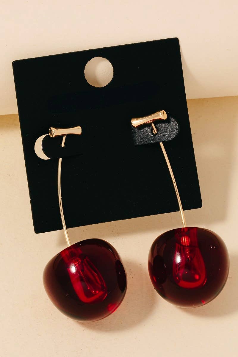 Boucles d'oreilles cerises fraîches mûres de l'arbre ! Cette boucle d'oreille unique comprend une goutte de cerise rouge foncé réaliste qui pend à votre oreille sur une fine tige dorée comme un fruit sur une vigne. La belle couleur rouge foncé passe du cramoisi profond à un rouge plus clair en bas. Ajoutez une touche de fraîcheur à votre mode avec ces adorables boucles d'oreilles goutte de cerise ! • Fabriqué en Chine • Boucles d'oreilles goutte de cerise 3D • La barre dorée s'insère dans la goutte de cerise pour un ajustement sécurisé • Matériaux : Métal ton or, Acrylique • Mesures : 2 1/2" X 1"