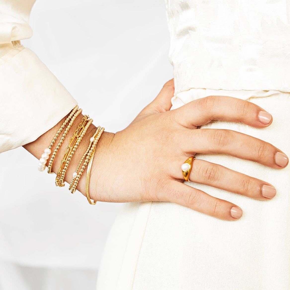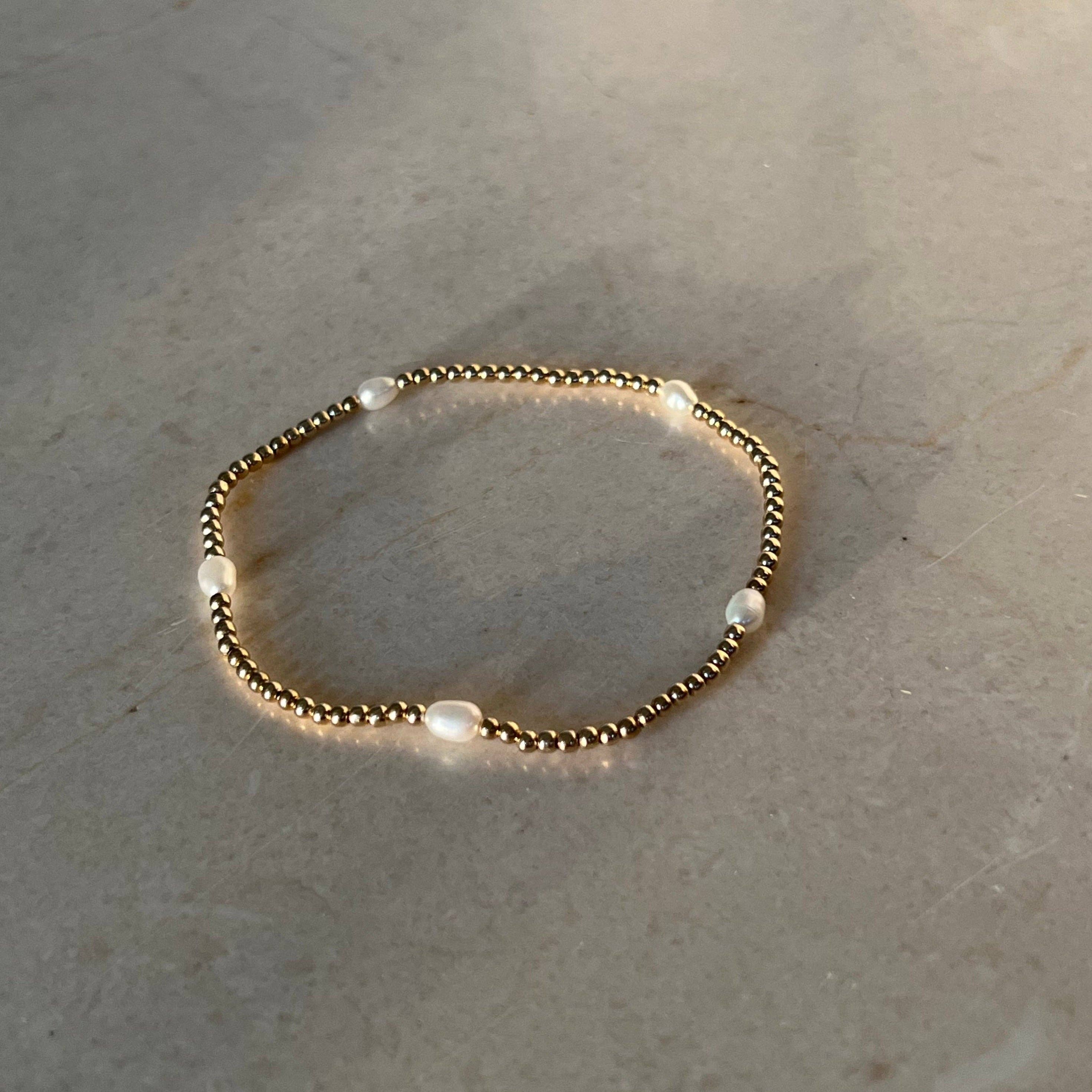 Ce bracelet en forme de boule d'or et de perles d'eau douce est la pièce de base parfaite pour votre pile de bracelets. Fabriqué avec des boules d'or de 3 mm remplies d'or 18 carats et une perle d'eau douce de 4 mm, ce bracelet ajoutera à coup sûr un look chic à n'importe quelle tenue ! Portez-le seul ou associez-le à votre bracelet Valencia pour un look superposé élégant.