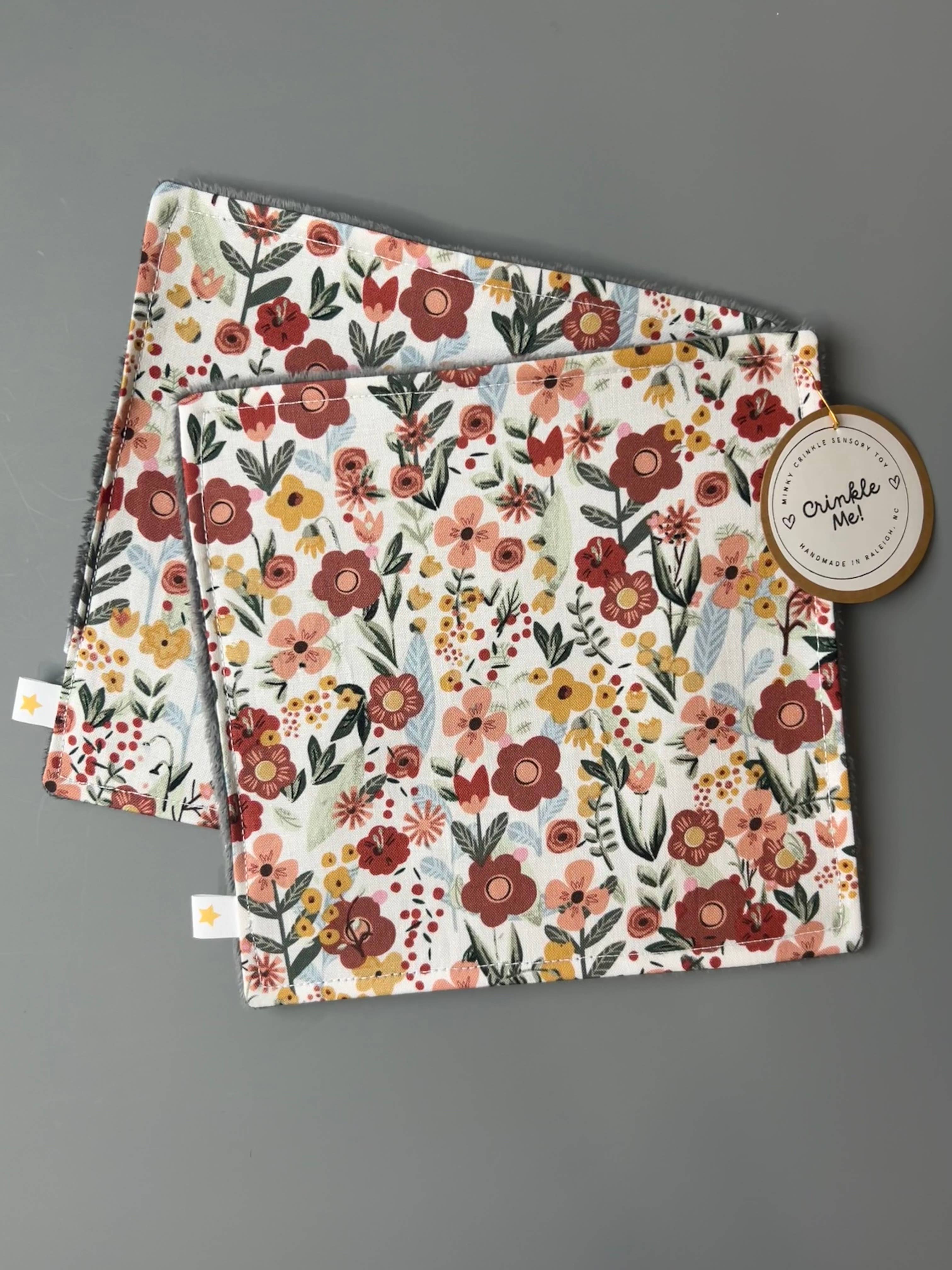 Les bébés ADORENT le son du froissement ! Ce jouet sensoriel n'est pas seulement amusant à entendre pour bébé, mais il est fabriqué avec un tissu minky et coton ultra doux pour un jeu sensoriel supplémentaire. Chaque jouet est en tissu coton/minky de 7"x7" avec un matériau froissé de haute qualité, testé en laboratoire et certifié à l'intérieur. Notre matériau froissé répond à des normes de sécurité strictes appelées Certification EN71 et CPSIA. Il est lavable en machine et peut être mis au sèche-linge sans se détériorer ni devenir fragile avec le temps. Le jouet froissé se lave en machine à froid, sèche-linge à basse température. Devant : 100% Coton Dos : 100% Polyester En raison de la répétition du motif de chaque tissu, les objets représentés sur chaque jouet peuvent varier légèrement.
