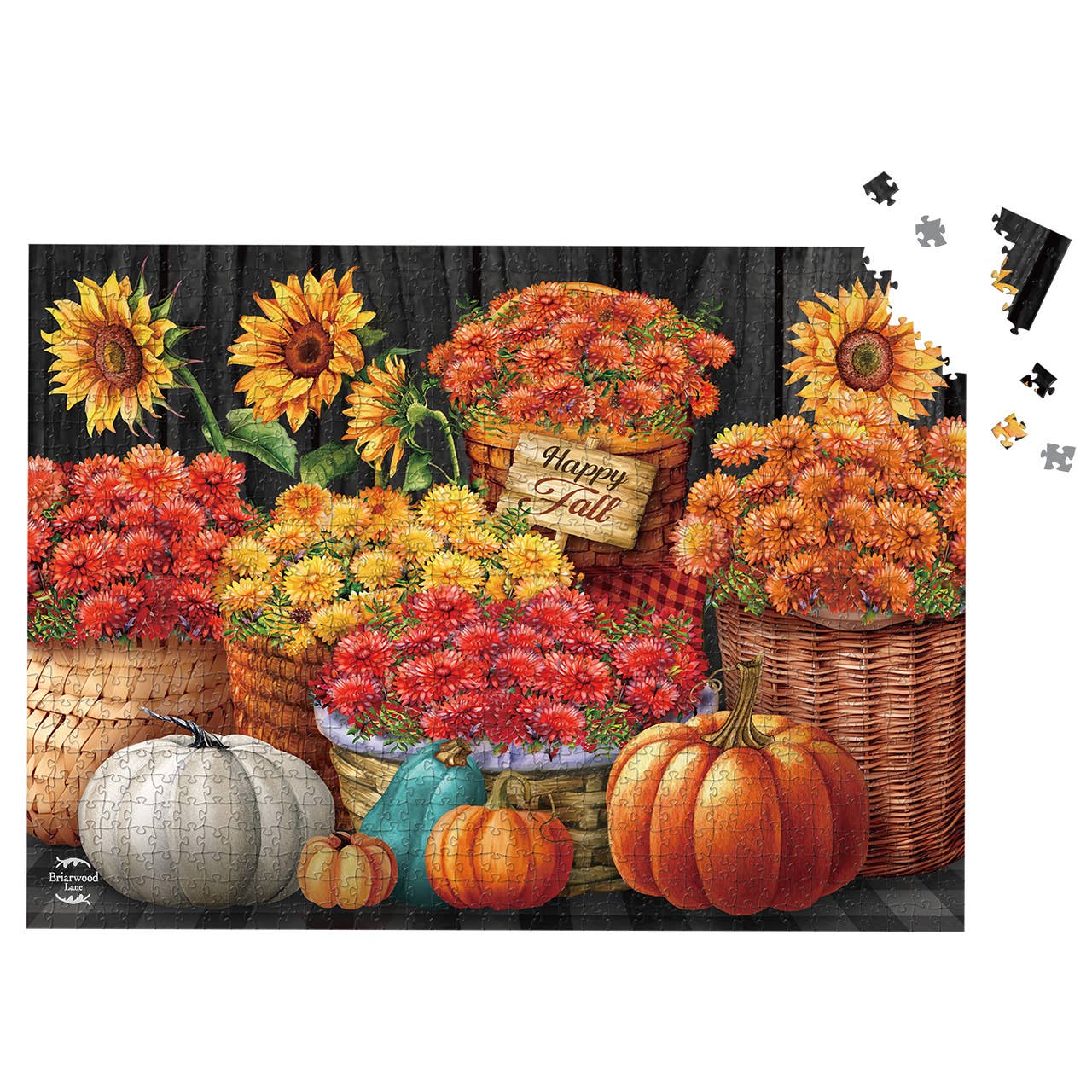 Marché fermier de 1780pz. C'est l'automne à la ferme. Des arbres colorés surplombent la structure et protègent contre les éléments. Le marché fermier regorge de produits frais cueillis directement sur place. Les poulets surveillent les citrouilles, les pommes, les carottes et plus encore. L'artiste Dominic Davison a saisi l'importance du shopping local dans ce puzzle de 500 pièces. Taille finale de 18 » x 24 ».