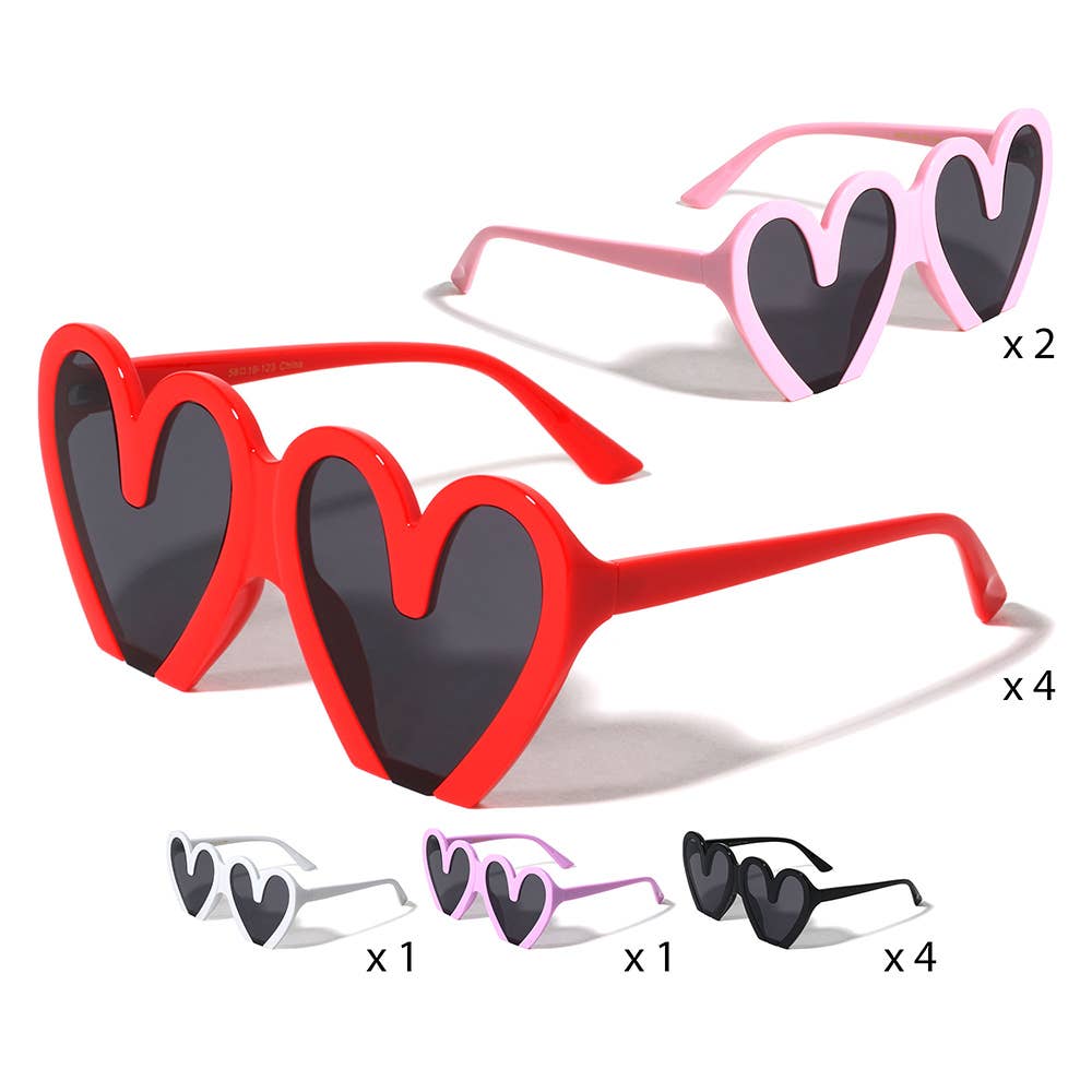 Lunettes de soleil rétro élégantes au style épuré. Ces lunettes de soleil en forme de cœur comprennent des montures œil de chat pointues et des verres colorés. * Fabriqué en Chine * Comprend un assortiment de couleurs illustrées. * Matériaux Montures en acrylique, verres en polycarbonate* Le préemballage comprend du noir, écaille de tortue, rose/noir, rose, rouge, ambre