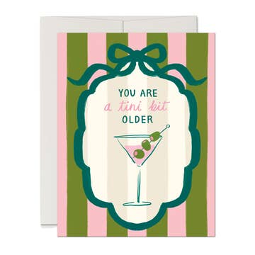 Envoyez un petit souhait d'anniversaire avec cette adorable carte d'anniversaire 5x7, mettant en vedette un verre de martini rose avec des olives adorables sur une bougie allumée et la phrase "un tout petit peu plus vieux". La carte est vierge à l'intérieur pour votre message personnel et est livrée avec une enveloppe en kraft marron. Parfait pour les anniversaires, les 21 ans et les amateurs de martini ! Détails : Taille : A7 ; mesure 5x7 pouces pliée Intérieur vierge Inclus : Enveloppe en kraft marron Livré emballé avec l'enveloppe dans une pochette en plastique transparent pour la protection Toutes les cartes de vœux de The Shelley Society présentent des œuvres originales de l'artiste Lauren Shelley
