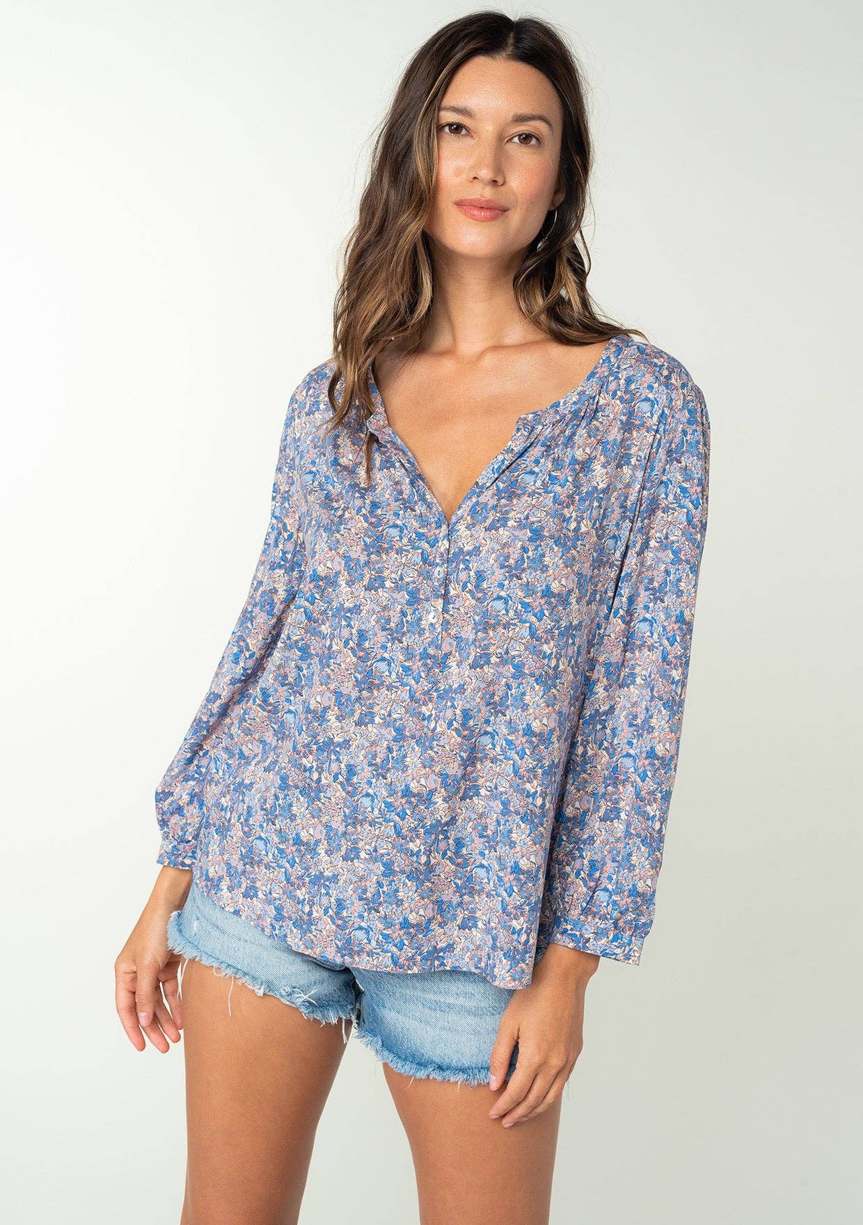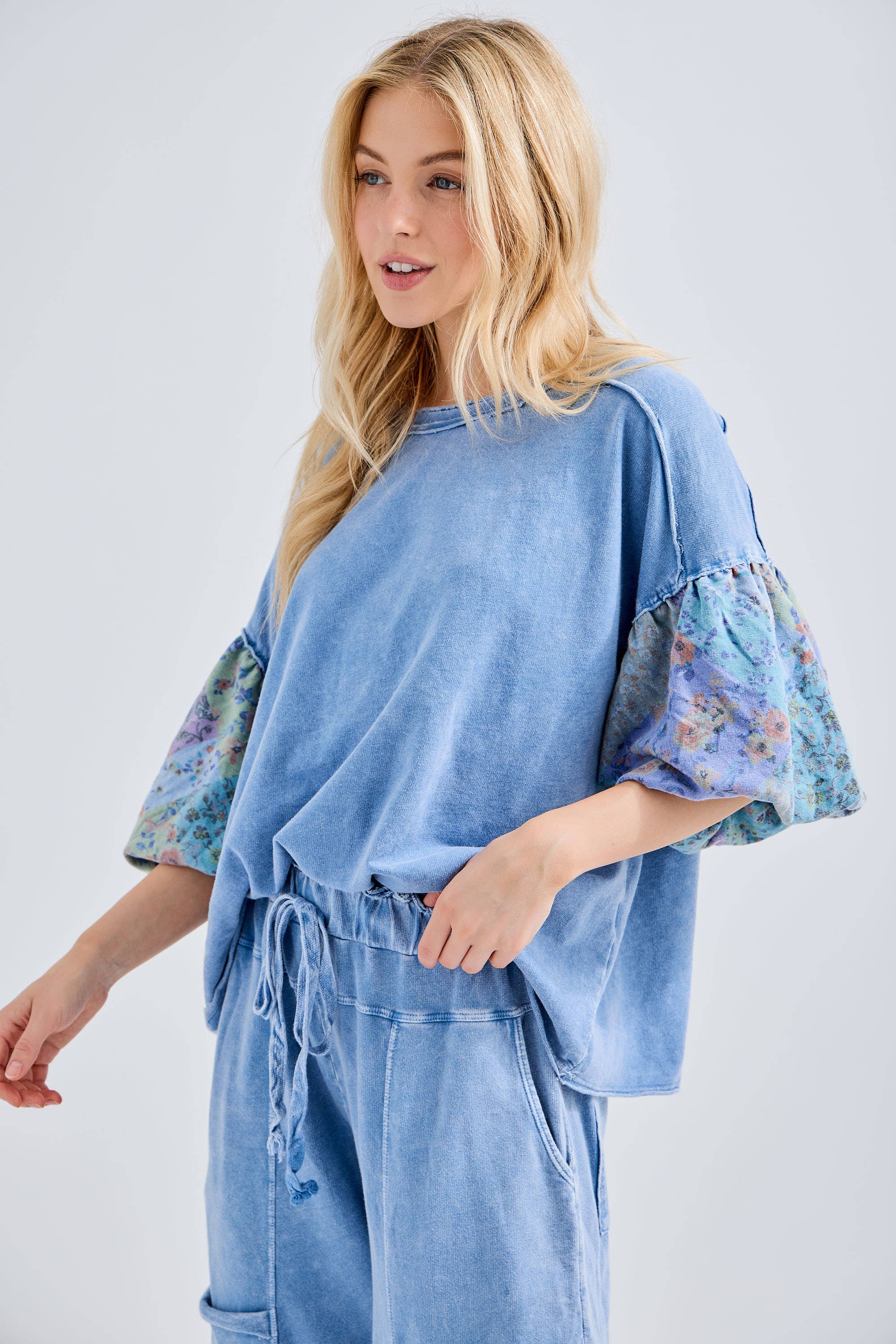 Blouse à manches bouffantes à patch floral bohème lavé minéral * Les couleurs réelles peuvent varier en raison des écrans affichant les couleurs différemment. *