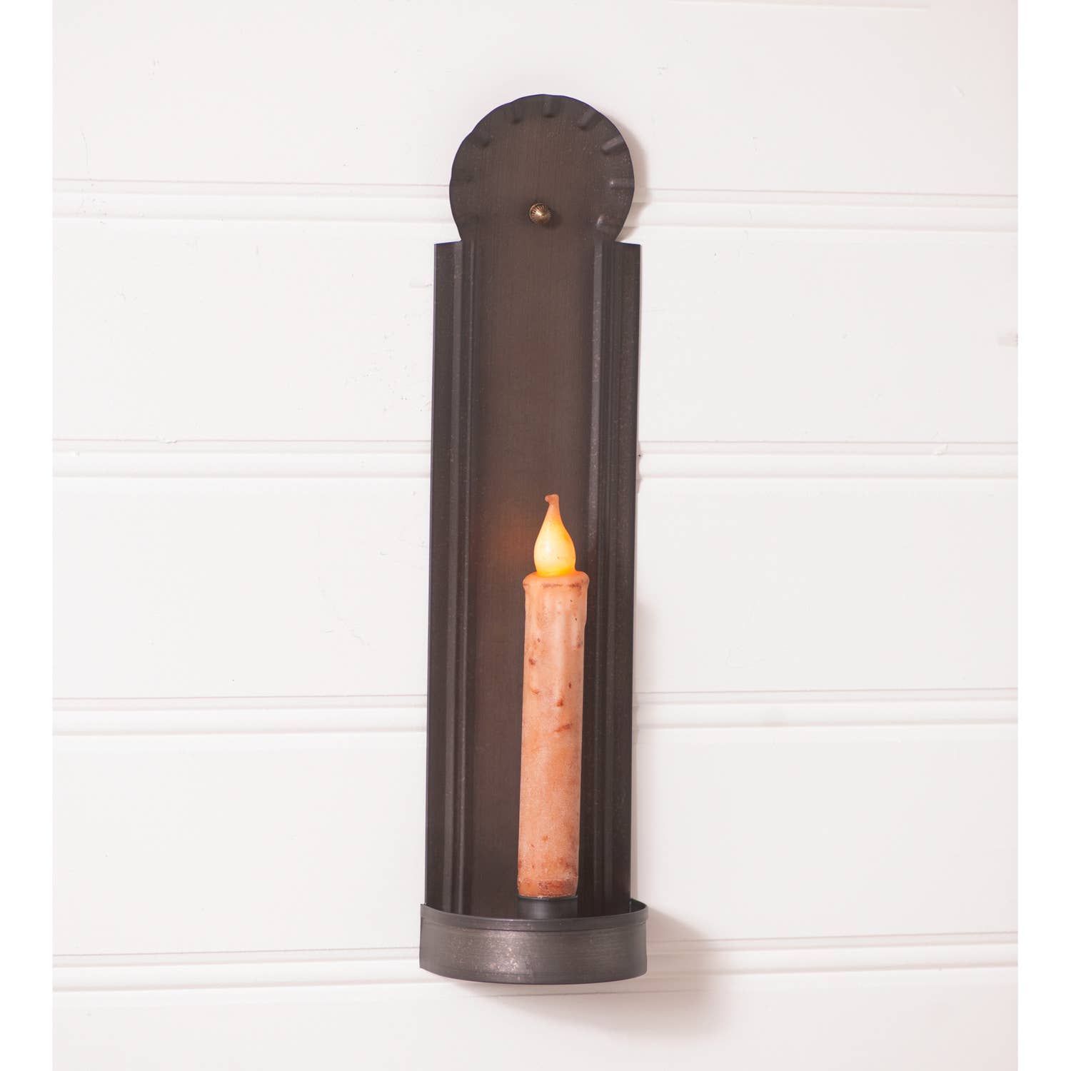 Applique murale en fer noir primitif. Bougies à minuterie vendues séparément. Fait à la main, de légères variations peuvent survenir. Environ 13,75" de long et 1,75" de large. Cette pièce en fer est fabriquée à la main par des artisans métalliers amish à Lancaster, Pennsylvanie, États-Unis. Avertissement : Les appliques en fer sont toutes fabriquées à la main localement. Veuillez noter que tous les trous sont percés avant la peinture et peuvent contenir de la peinture séchée dans les trous de montage. La peinture s'enlève facilement lorsque vous insérez un clou ou une vis de montage.