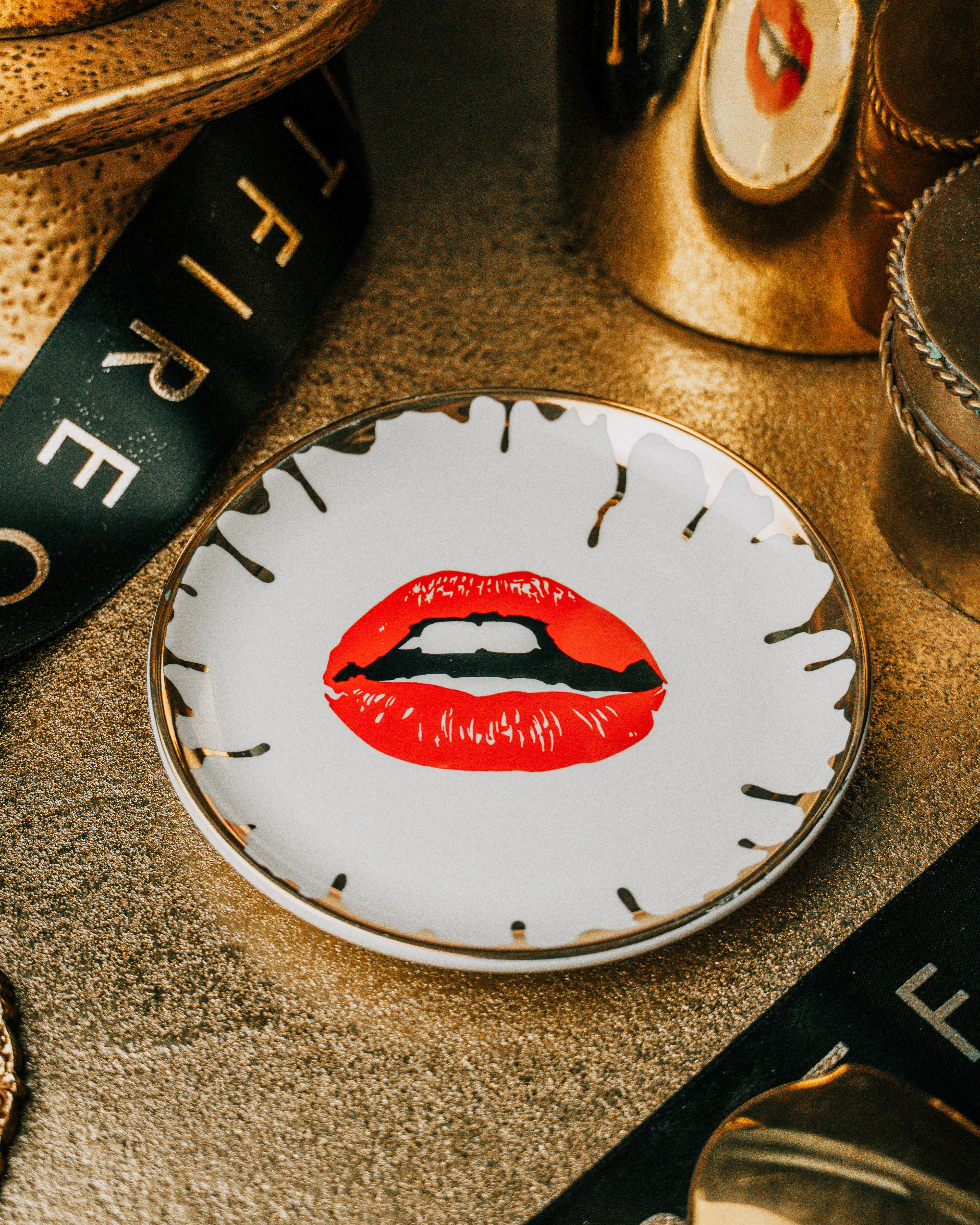 Apporte une touche d'élégance artistique à votre espace. Mesurant 4 pouces de diamètre, ce plat en porcelaine présente un motif de lèvre rouge saisissant entouré de touches dorées abstraites. Son design luxueux associe un modernisme ludique à une touche d'allure vintage, ce qui le rend parfait pour servir de petites bouchées ou pour exposer des bibelots. Fabriqué avec des matériaux sûrs pour les aliments, ce plat est aussi fonctionnel qu'élégant : une pièce maîtresse pour votre cuisine ou votre espace de vie.