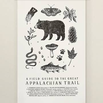 En l'honneur du 50e anniversaire du sentier Allegheny en 2024, j'ai créé une carte aquarelle peinte à la main pour célébrer le plus long sentier de randonnée de Virginie-Occidentale. Cette impression artistique de 11x14 pouces présente les 311 miles du sentier Allegheny, ainsi que des lieux emblématiques le long du parcours. Sept vignettes illustrées mettent en valeur Cheat Canyon, Blackwater Falls, Guadineer Knob, la tour d'incendie de Thorny Mountain, le chemin de fer panoramique de Cass, l'observatoire de Green Bank et l'observatoire de rapaces de Hanging Rock. La carte met également en avant la flore et la faune qui habitent le long du sentier : le lapin à queue blanche des Appalaches, la chauve-souris de Virginie à grandes oreilles, la salamandre de Cheat Mountain, les morilles, le sabot de Vénus rose et l'ail des bois. Créé en Virginie-Occidentale sur du papier richement texturé avec des encres vibrantes.