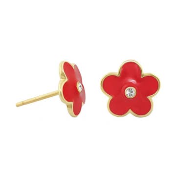 Petites boucles d'oreilles puces représentant une abeille et une marguerite. Plaqué or 18 carats avec détails en émail. Tiges en argent sterling hypoallergénique. Fermoirs papillon simples. Dimensions : marguerite - largeur 7 mm x hauteur 7 mm ; abeille - largeur 9 mm x hauteur 7 mm.