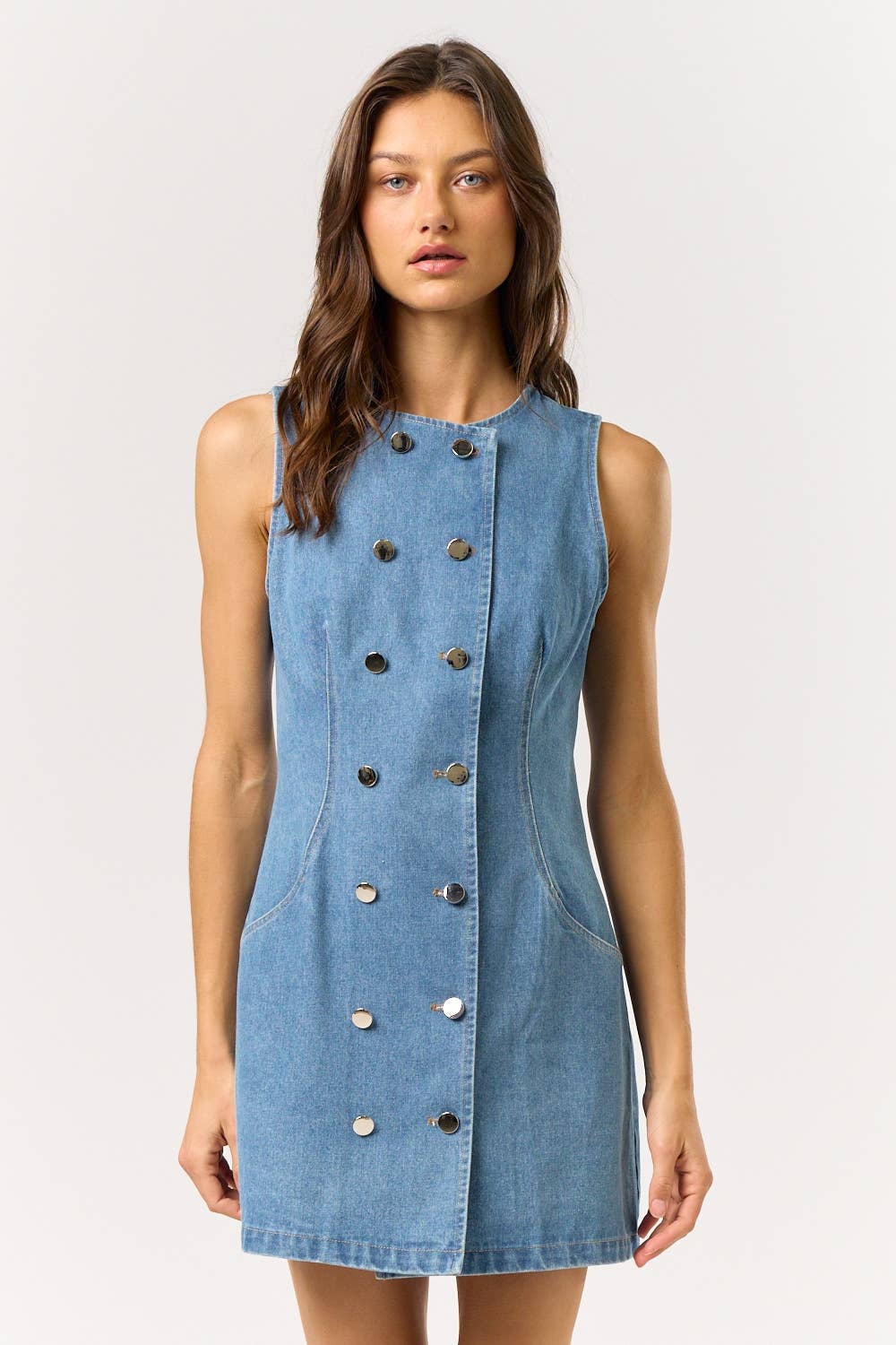 Robe en denim stretch à encolure droite avec patte de boutonnage en vente B2B
