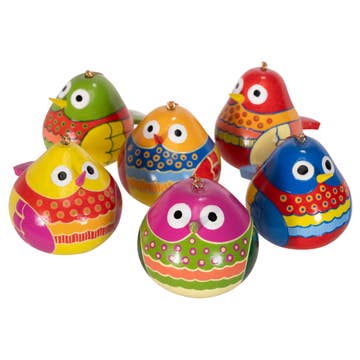 Plutôt que d'utiliser des méthodes de chauffage au bois pour colorer les courges. Ces gourdes décoratives sculptées sont fabriquées dans le style primavera, les motifs étant sculptés puis peints avec des couleurs vives. Caractéristiques : 2,5 à 3 pouces. Chaque pièce est unique. La taille, la forme et la couleur peuvent varier.