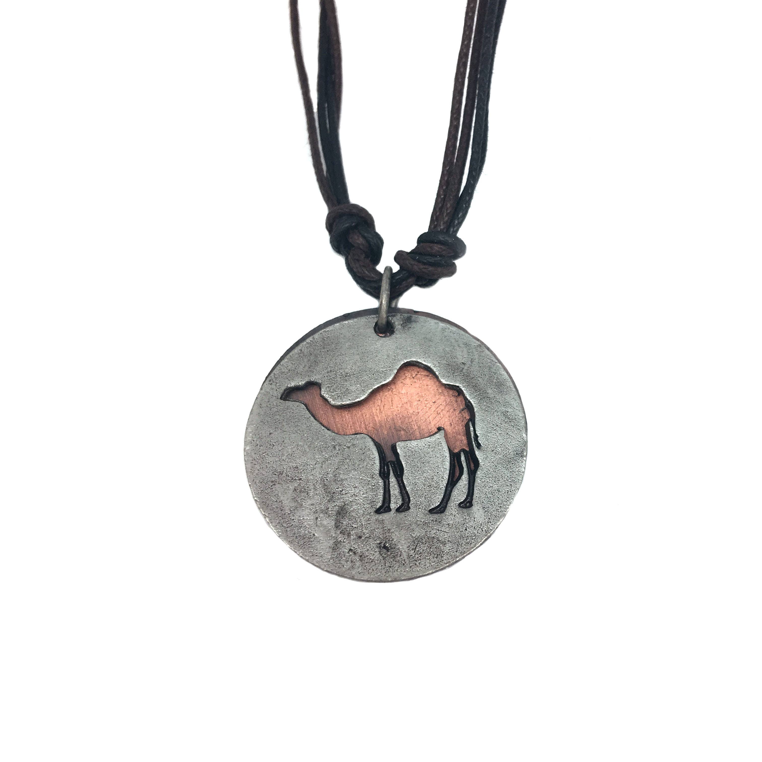Les chameaux sont une source de transport, de force et de nourriture dans les déserts égyptiens depuis des milliers d'années. Le chameau d'Arabie est un dromadaire à bosse unique qui mesure jusqu'à 11 pieds et pèse jusqu'à 1500 livres ! La viande, les os et le lait de chameau ont aidé les gens à survivre dans le désert chaud et aride du Sahara. Longueur du pendentif : 7,5 pouces Matériaux : Pendentif en étain avec chaîne en laiton imitation rhodié de 18 pouces Fabriqué aux États-Unis