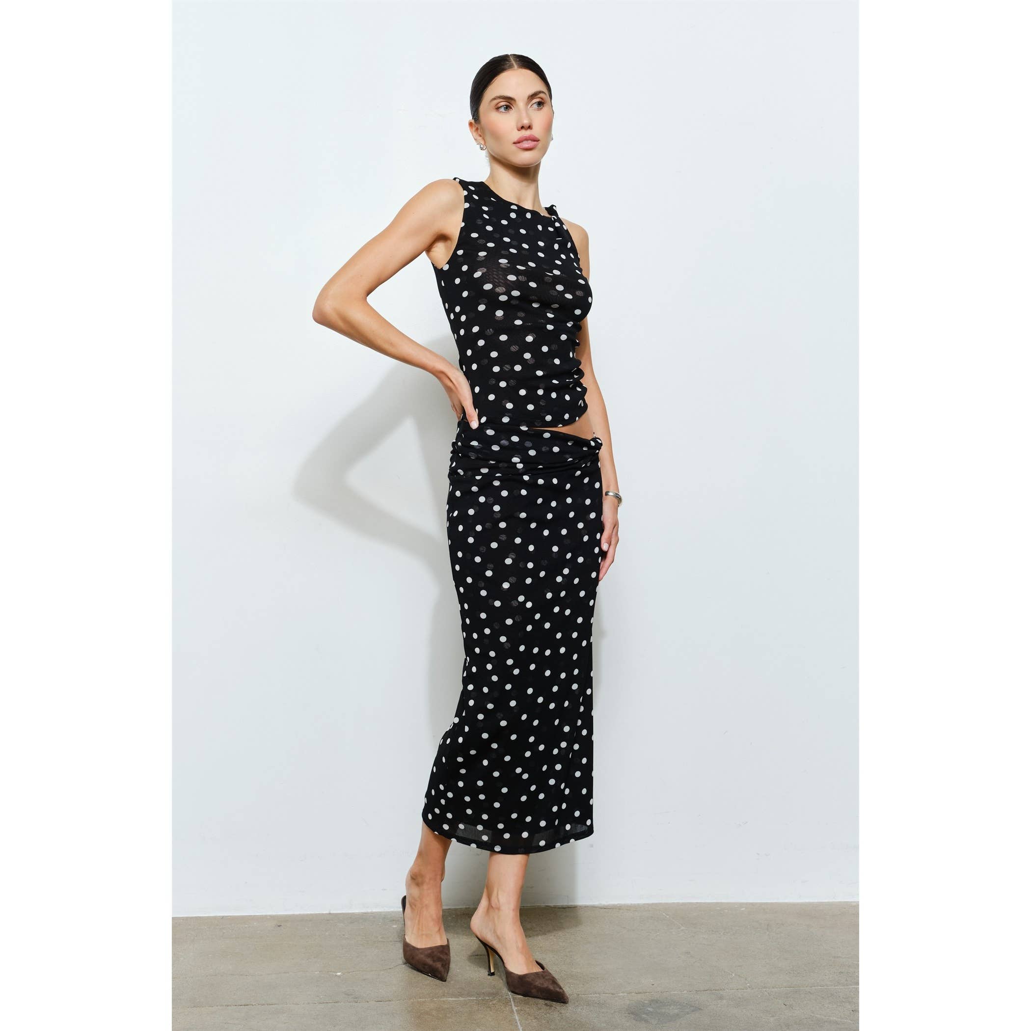 La jupe Melinda est une silhouette mi-longue confectionnée dans un tissu léger à pois pour une sensation douce et fluide. Dotée de détails froncés à la taille et d'une fermeture éclair invisible au centre du dos, elle combine une texture subtile avec des lignes épurées.