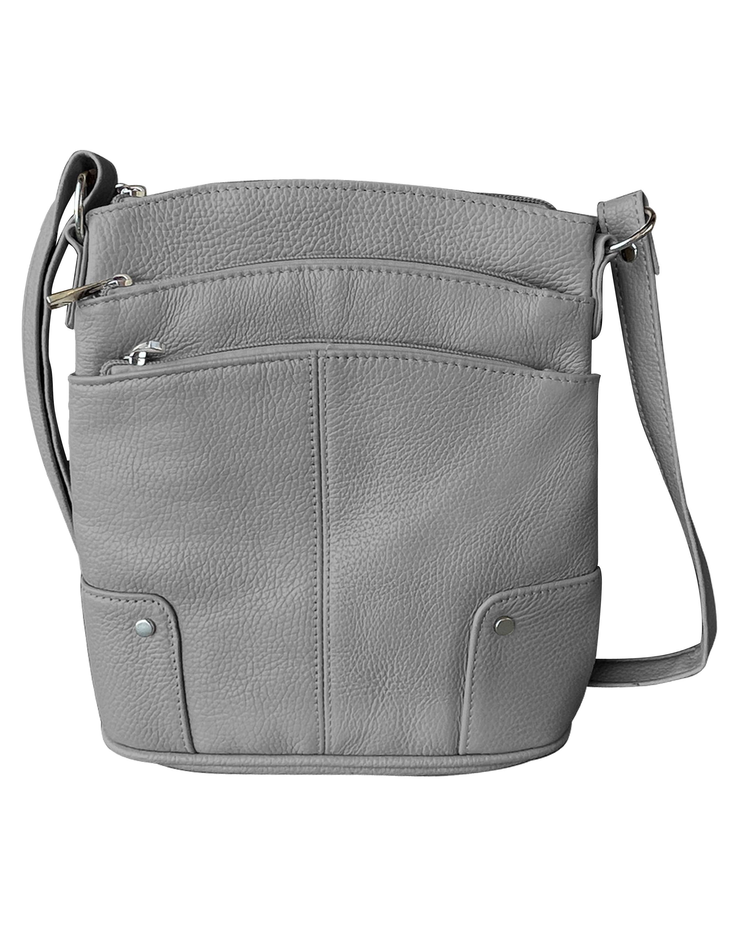 Sac à bandoulière à cinq compartiments. Bandoulière ajustable. La face avant est dotée d'une petite poche zippée. Des emplacements pour cartes de crédit et une fenêtre d'identification transparente. La face arrière comporte une poche supplémentaire pour un téléphone portable. Cuir de vachette. Taille : 8½ » x 7 ».
