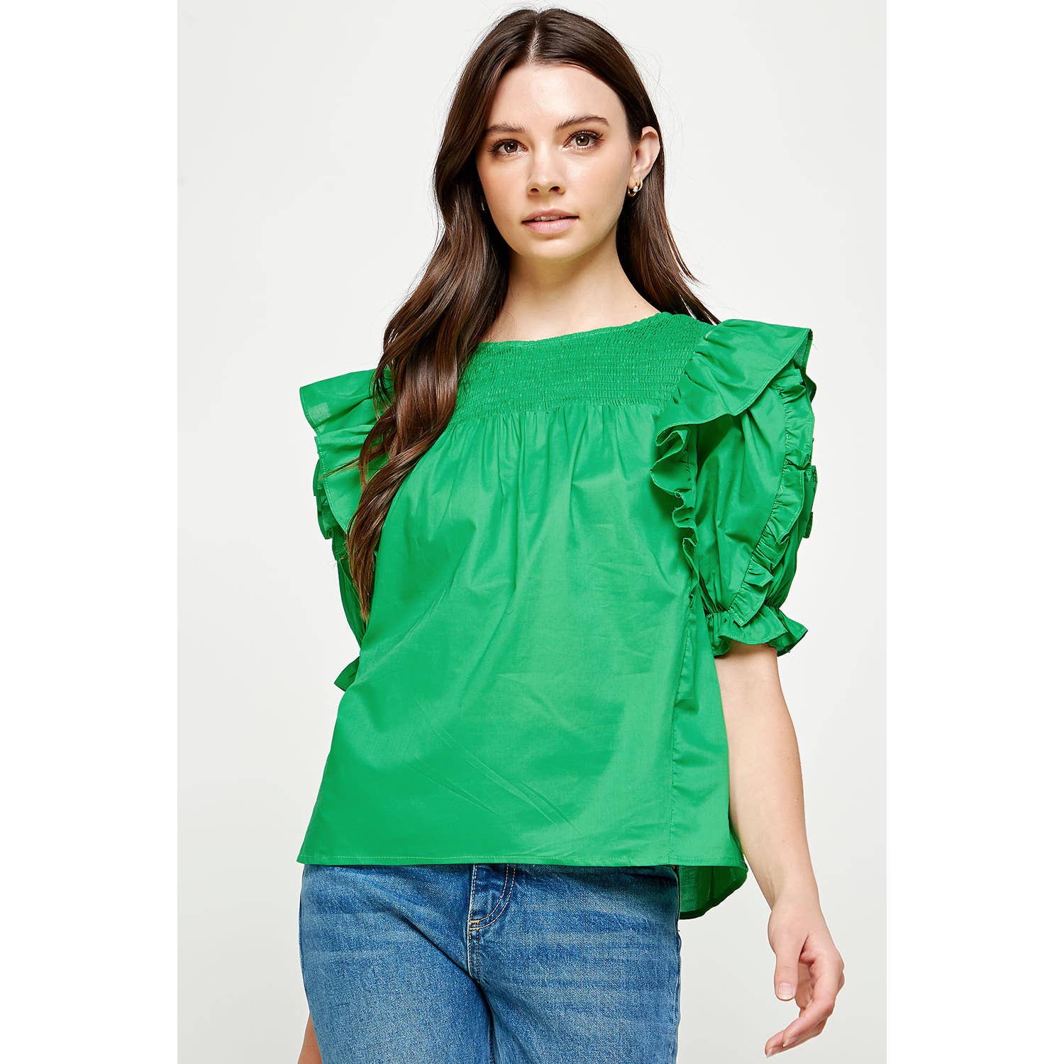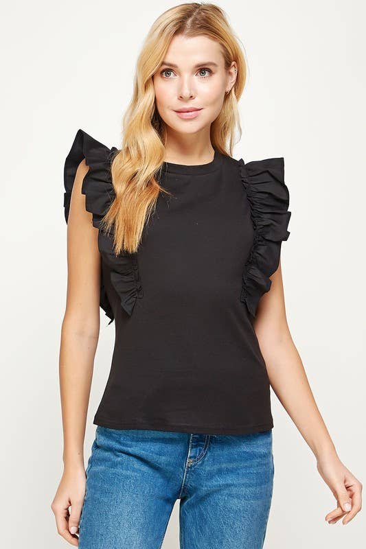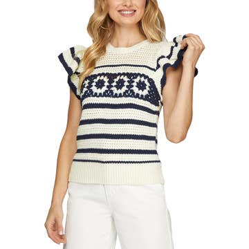 Haut à manches courtes à tissage ouvert en tricot. Ce modèle présente des touches color-block, un col en V côtelé et festonné classique, un ourlet à rayures côtelées et des volants aux épaules.