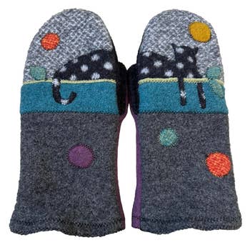 Ce sont des gants sans doigts en cachemire magnifiquement chauds. Tous les gants sont fabriqués individuellement en cachemire recyclé super doux, légèrement feutré et freestyle appliqués de sorte que chaque paire est unique en son genre. Le haut du doigt ouvert vous donne la liberté de conduire, de texter, de tricoter, de lire ou de boire du café. Rentrez simplement vos doigts à l'intérieur si froid !