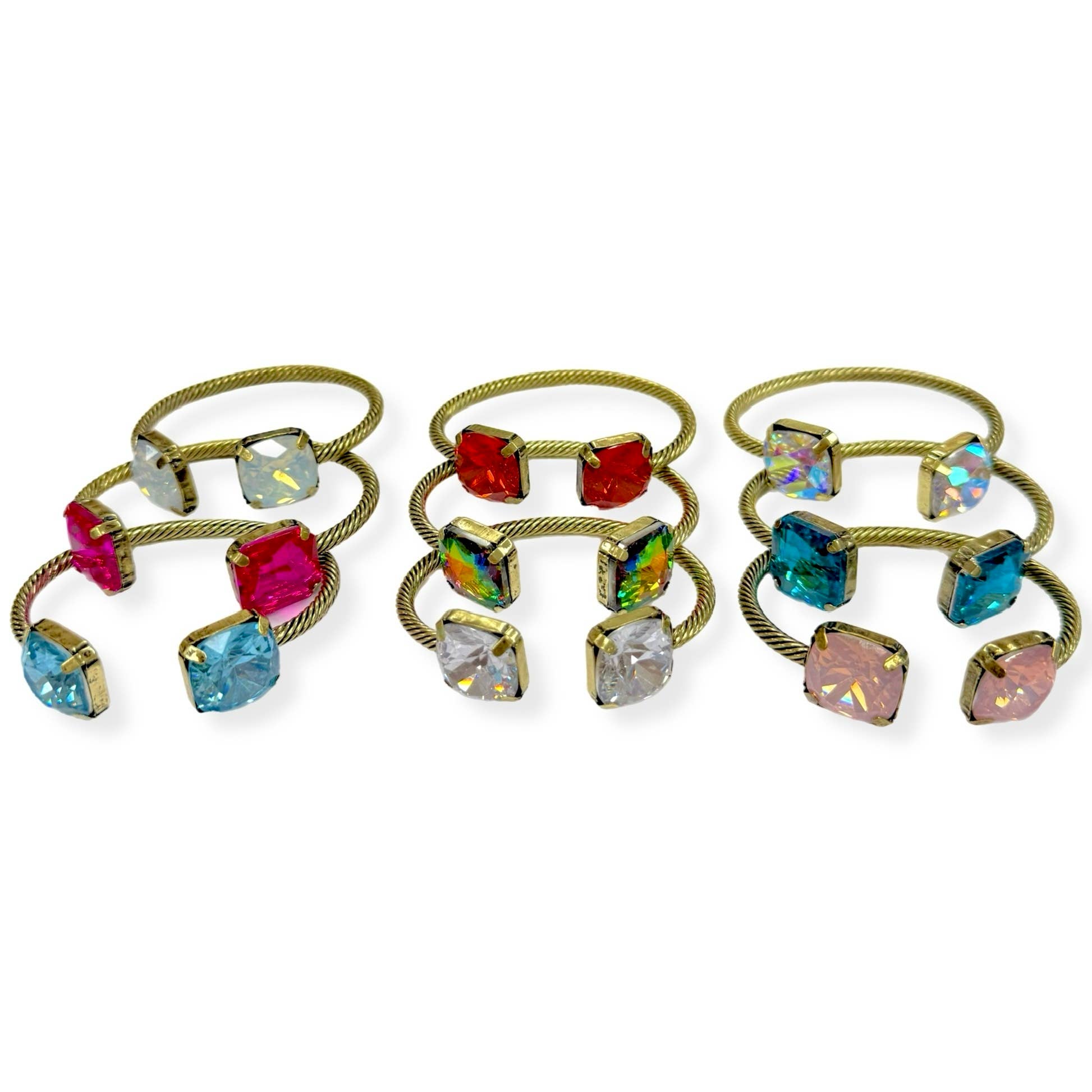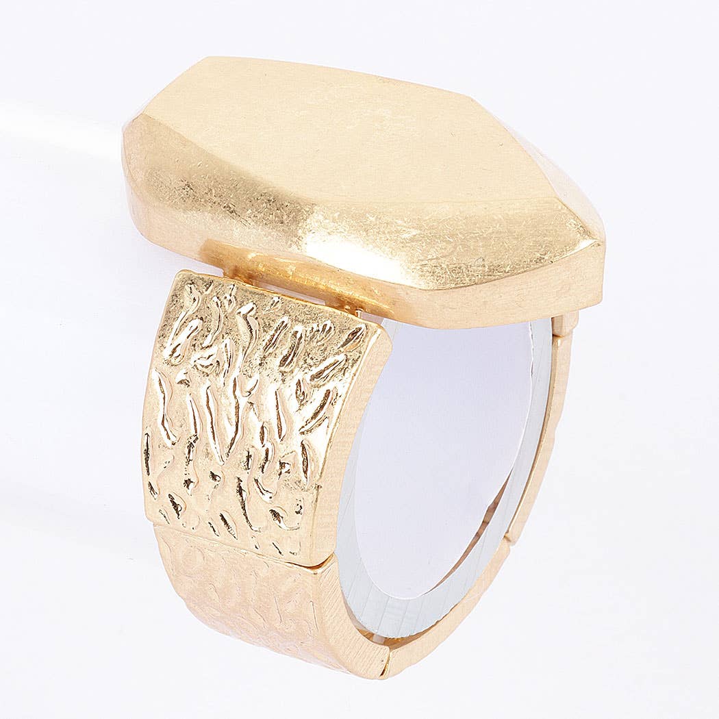Bracelet jonc large à charnière orné de pierres ovales, en forme de larme et rondes • Taille : 2,8" H, 2,5" D • Fermeture à charnière • Conforme au plomb et au nickel Faites tourner les têtes avec ce bracelet manchette éblouissant, doté d'un bandeau en métal ajouré orné de grandes pierres précieuses facettées qui scintillent à chaque mouvement. La texture martelée du bracelet ajoute une touche artisanale et haute couture, tandis que les pierres de formes variées—allant de l'ovale et la larme au marquise—créent un look dramatique et luxueux. Parfait pour les événements formels, les sorties nocturnes ou chaque fois que vous souhaitez rehausser votre tenue, ce bracelet audacieux combine une brillance accrocheuse avec un design élégant. Sa structure ouverte offre un ajustement confortable et adaptable à la plupart des tailles de poignet.