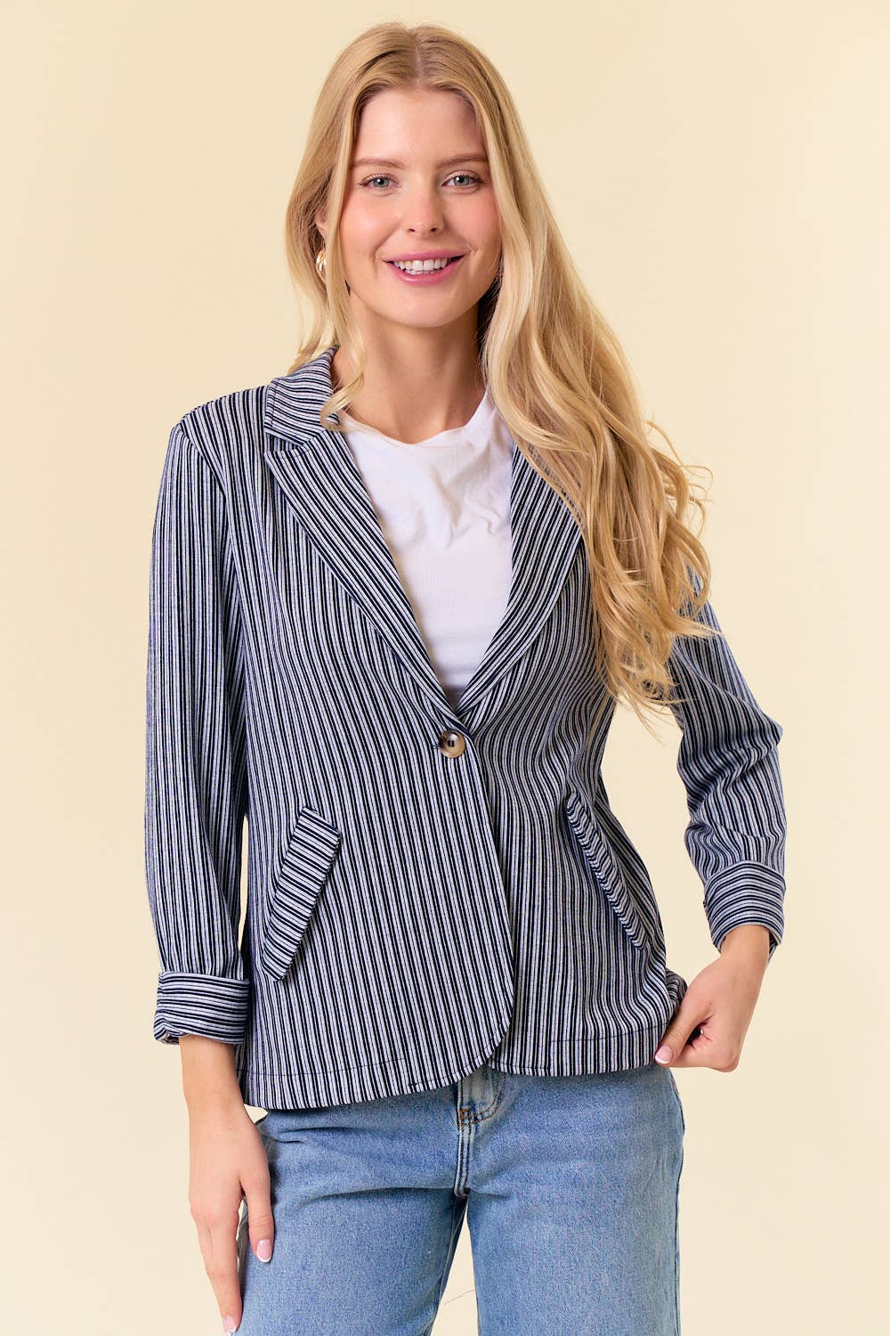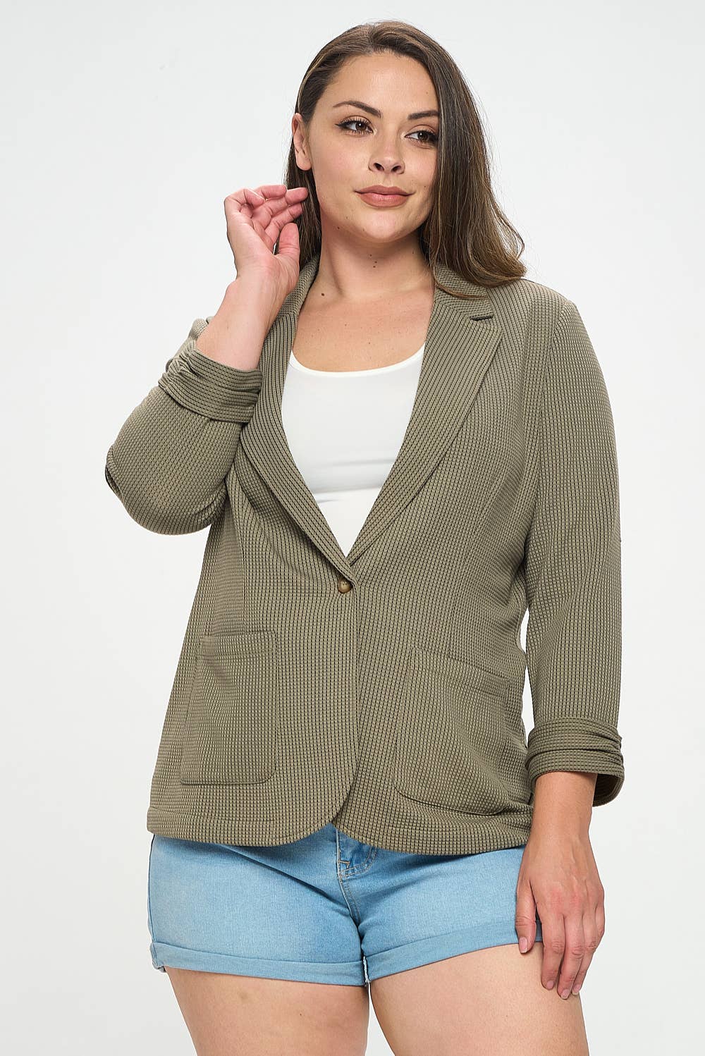 BLAZER TEXTURÉ À MANCHES FRONCÉES - Blazer texturé élégant avec un motif en tricot côtelé sophistiqué - Design unique à manches froncées, ajoutant une touche élégante et féminine - Fermeture avant à bouton unique pour un look élégant et polyvalent - Poches frontales fonctionnelles pour plus de commodité et de style - Col à revers cranté pour une silhouette de blazer classique MESURES DE STYLE (TAILLE S) - LONGUEUR TOTALE 27 POUCES - BUSTE 18 1/4" - TAILLE 16 1/4" - LONGUEUR DES MANCHES 19 POUCES - ÉPAULE 15 POUCES 97 % POLYESTER, 3 % ÉLASTHANNE LE MANNEQUIN MESURE 5 PIEDS 10 POUCES | TOUR DE POITRINE 34 POUCES | TAILLE 24 POUCES | HANCHES 35 POUCES ET PORTE UNE TAILLE S