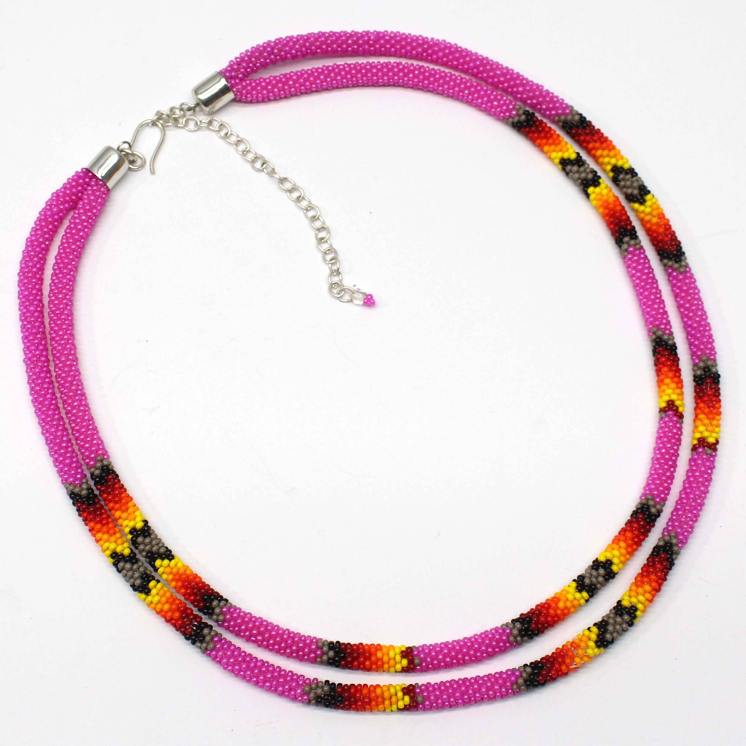 Ce collier à double rangée de perles de style amérindien est une pièce de joaillerie exceptionnelle qui met en valeur l'héritage riche et le savoir-faire de la culture amérindienne. Le collier présente un travail de perles complexe aux couleurs vibrantes, conçu avec deux rangées formant un motif élégant rappelant une corde. Les perles sont soigneusement tissées à la main selon des techniques traditionnelles, créant ainsi un accessoire unique et remarquable. Ce collier est non seulement un bel ajout à toute tenue, mais aussi un symbole d'appréciation et de respect culturel. - Savoir-faire exquis : chaque collier est fabriqué à la main par des artisans qualifiés, avec un design à double rangée alliant techniques traditionnelles et esthétique moderne. - Matériaux de haute qualité : réalisé avec des perles de rocaille tchèques premium, reconnues pour leur durabilité et leurs couleurs vives, garantissant un collier non seulement magnifique mais aussi durable. - Taille parfaite : chaque rangée de perles mesure entre 40 et 43 cm, offrant un ajustement confortable qui met en valeur diverses encolures et styles. - Style polyvalent : idéal pour les occasions décontractées comme formelles, ce collier apporte sophistication et une touche d'artisanat à toute tenue. - Choix de mode durable : en choisissant ce collier fait main, vous soutenez le travail artisanal traditionnel et affirmez votre engagement envers une mode éthique.