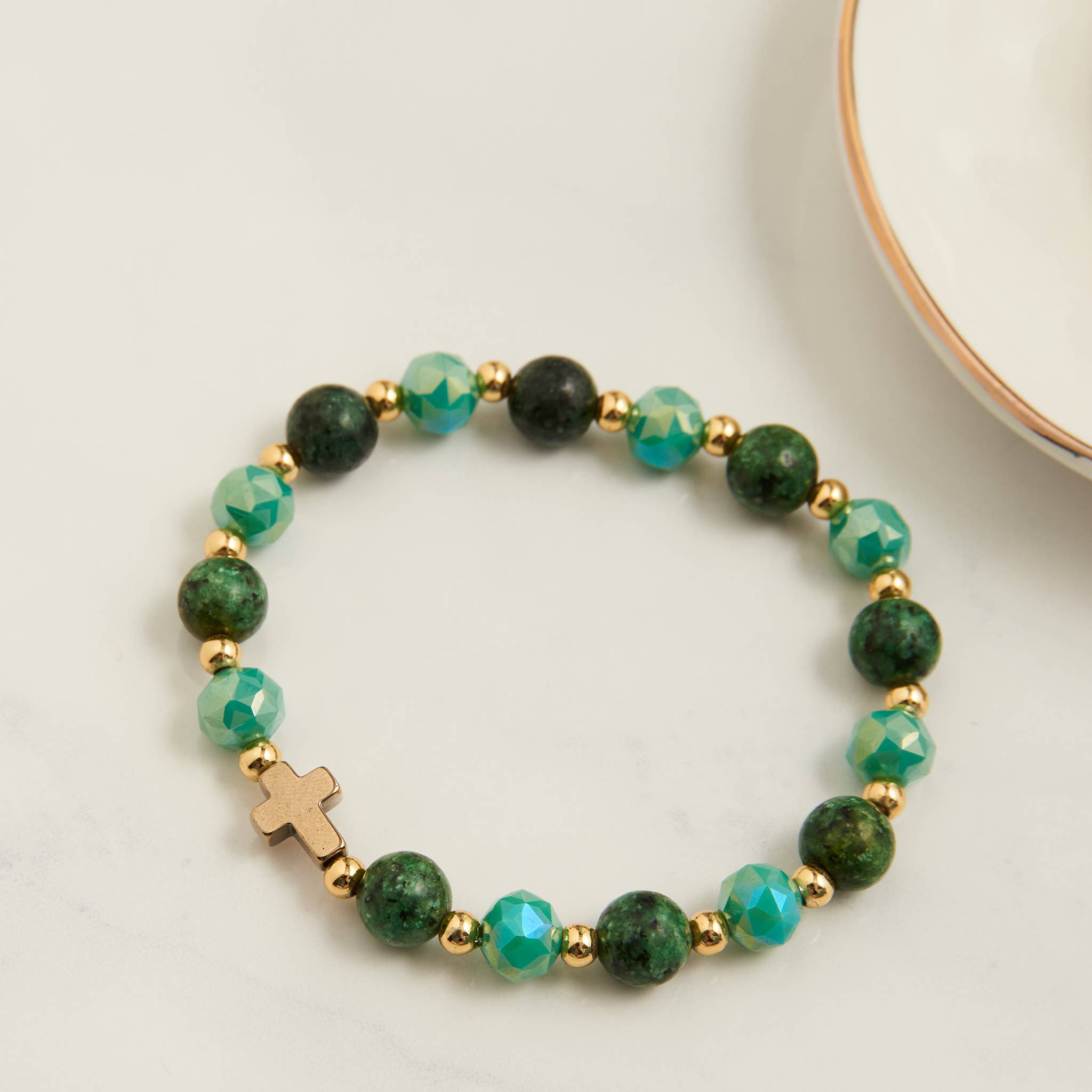Cet élégant bracelet chapelet est composé de perles de lave vertes mates et de perles à facettes opaques citron vert. Des séparateurs ronds métalliques sont inclus, et une petite croix en métal et une breloque en forme de cœur sont attachées à l'anneau du bracelet. Le bracelet est élastique et s'adapte