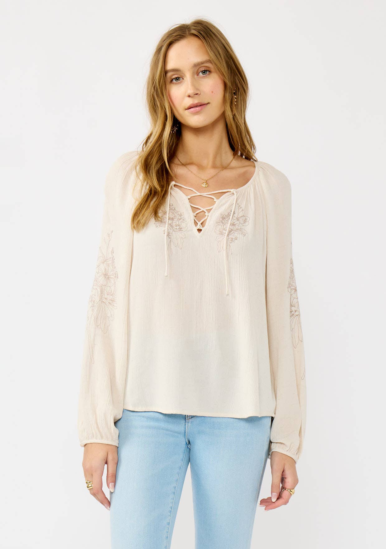 Ce haut à manches 3/4 et col en V associe des plis et des broderies florales à des poignets élastiques. Il est confectionné à partir d'un mélange de lin flammé pour un style polyvalent qui passe du décontracté au chic.