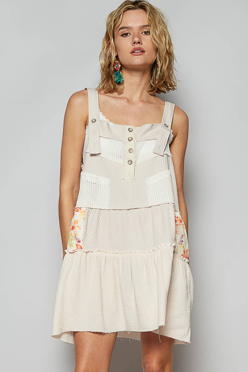 Conçu dans un haut ample à manches courtes et col en V en sergé avec des détails découpés au laser, patchwork à rayures ton sur ton, poche en dentelle et détail de patch au dos. Spécifications/Dimensions : - POITRINE : 24" - LONGUEUR : 24"