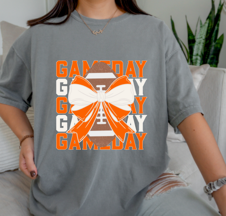 T-shirt teint en pièce Orange Noir Football GameDay avec nœud.
