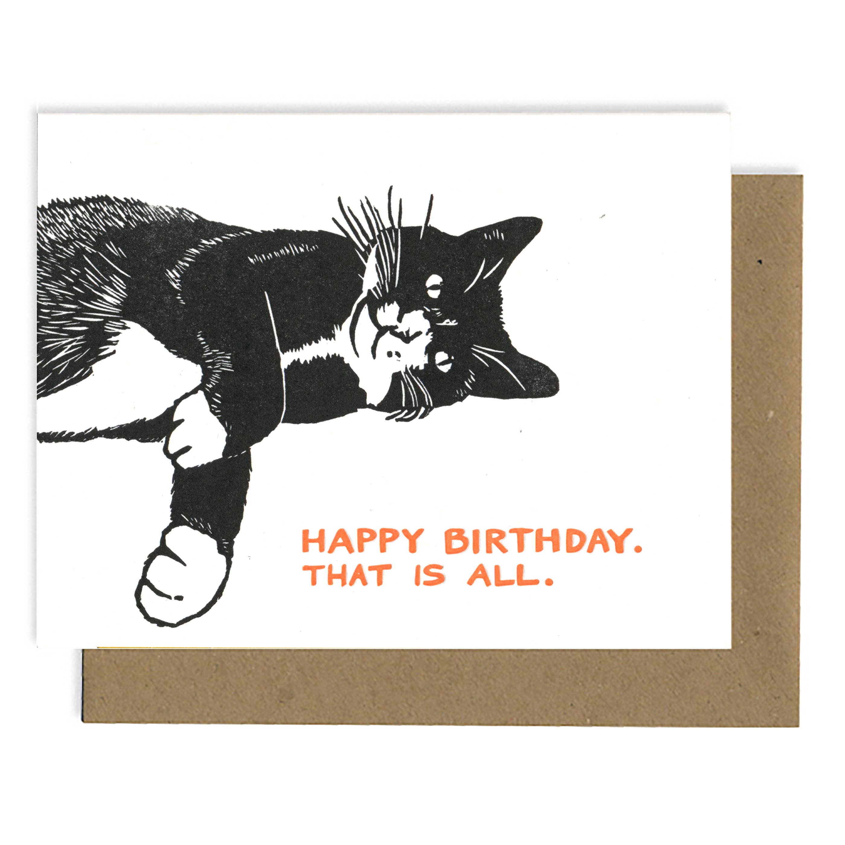 Cette carte imprimée par typographie est ornée d'un linoléum gravé à la main représentant un chat smoking paresseux à l'encre noire. Il s'agit d'un spin-off de notre carte à succès « Cat Love You ». Les mots écrits à la main : « Joyeux anniversaire. C'est tout », sont imprimés en orange à l'aide de techniques typographiques modernes. Intérieur vierge. Enveloppe en kraft incluse. Taille A2