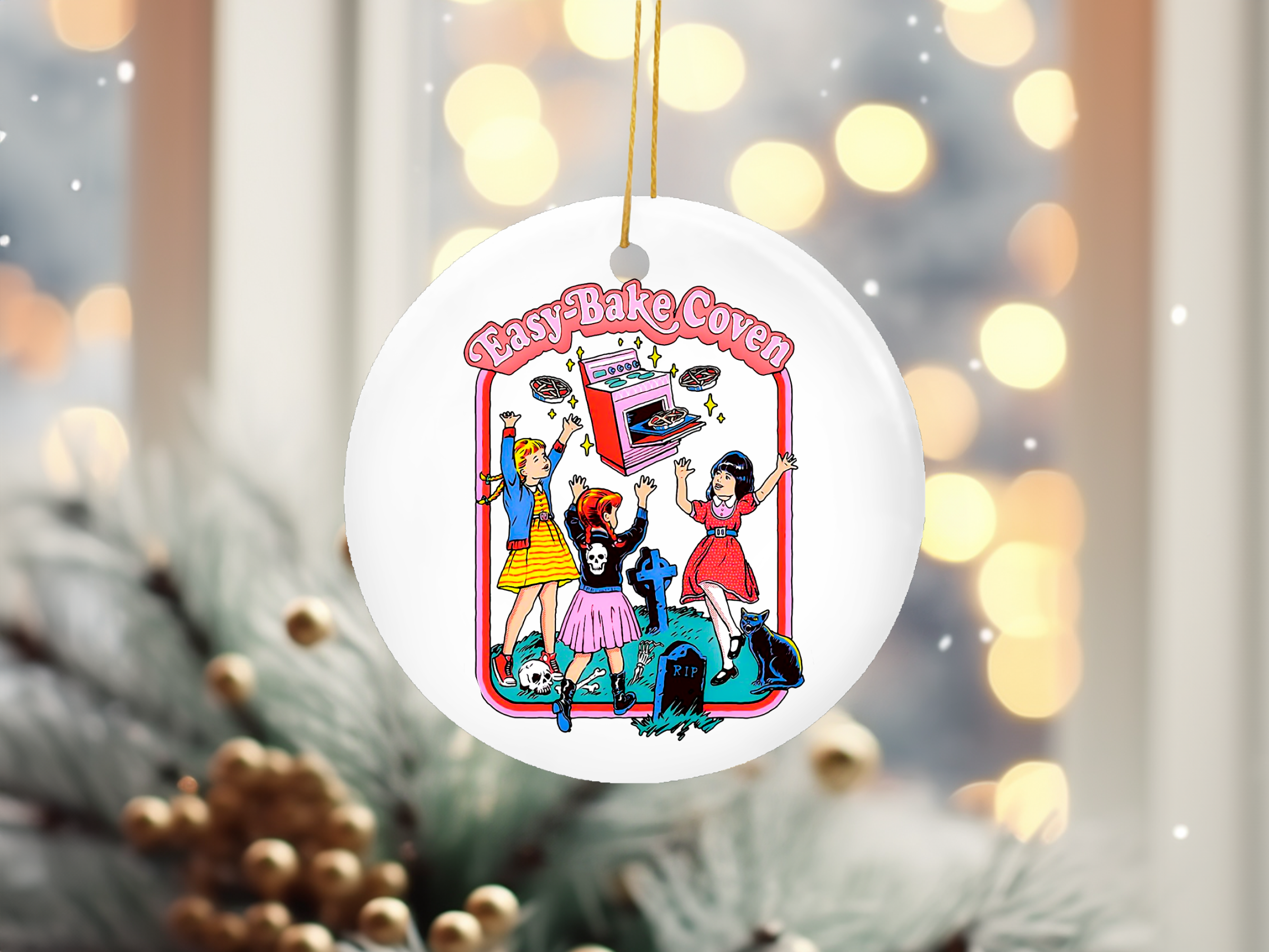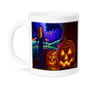 Tasse à café Easy Bake Coven avec un design rétro d’Halloween représentant une sorcière, un fantôme, une citrouille et des éléments de film d’horreur. Imprimée et expédiée de Caroline du Nord. Compatible avec le lave-vaisselle, panier supérieur uniquement. Impression des deux côtés.