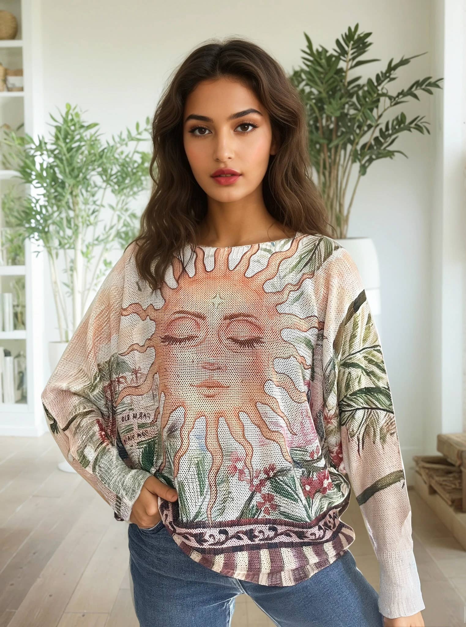 Pull en maille en col rond, manche longue chauve souris, imprimé Le pull a pour longueur 62 cm et tour de poitrine 112 cm Le pull maille peut s'adapter d'une taille 36 - 44/46, elle s'adapte à chaque morphologie Le pull est disponible dans d'autre motifs sous la référence 29F12H57