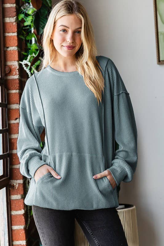 Haut à manches longues avec ourlet arrondi, épaules tombantes, col rond et détails en maille gaufrée.