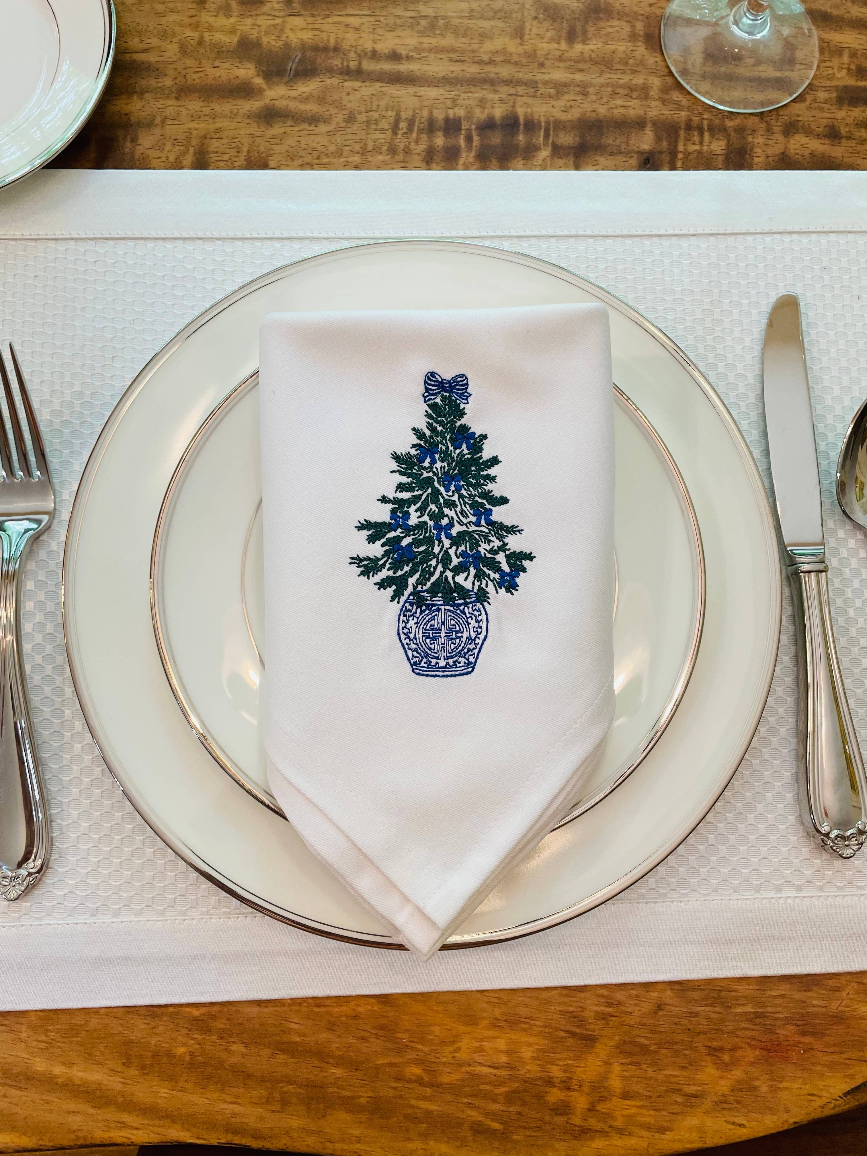 Fait partie de notre collection de serviettes Chinoiserie : le sapin de Noël Chinoiserie avec nœuds bleus Taille : serviettes de table de style « fine dining » en coton épais de 24 x 24 pouces ; 100 % coton égyptien